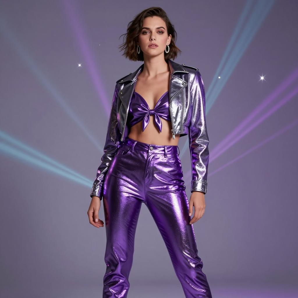 Outfit disco, photorealistic, female model, short brown hair, serious expression, wearing metallic purple and silver crop jacket and high-waisted pants, tied crop top, shiny ure, futuristic background, radiant light beams, starry pattern, earrings, standing pose, full body, fashion photography style, high contrast, vibrant colors