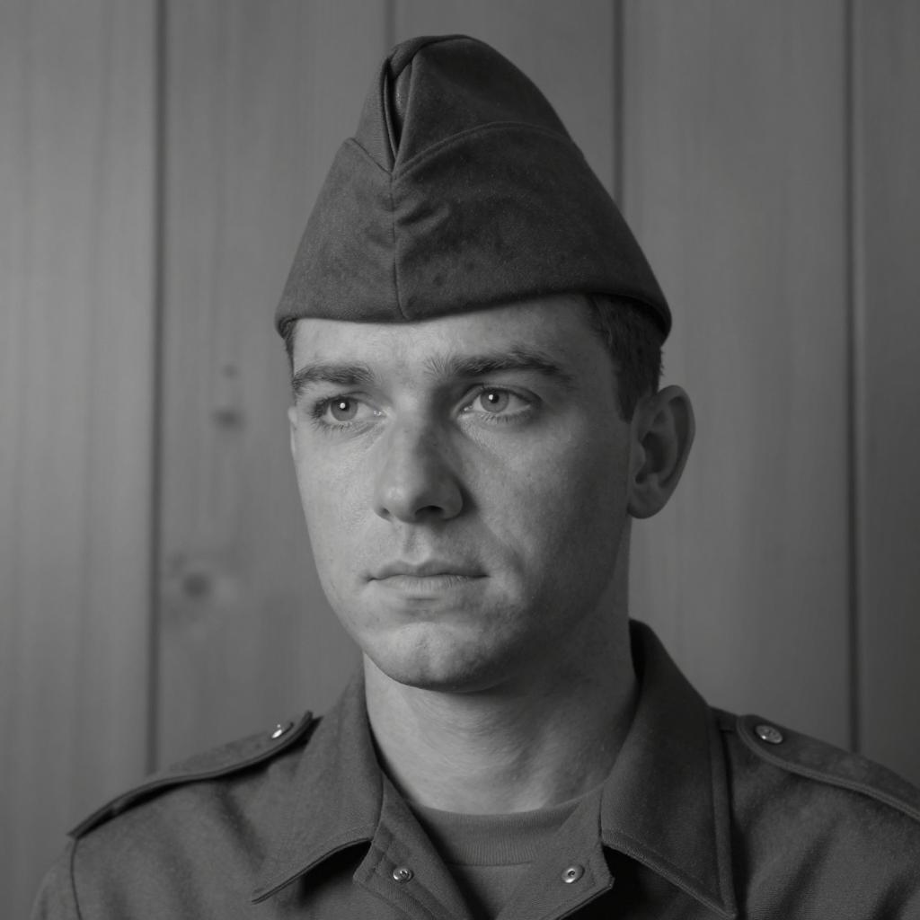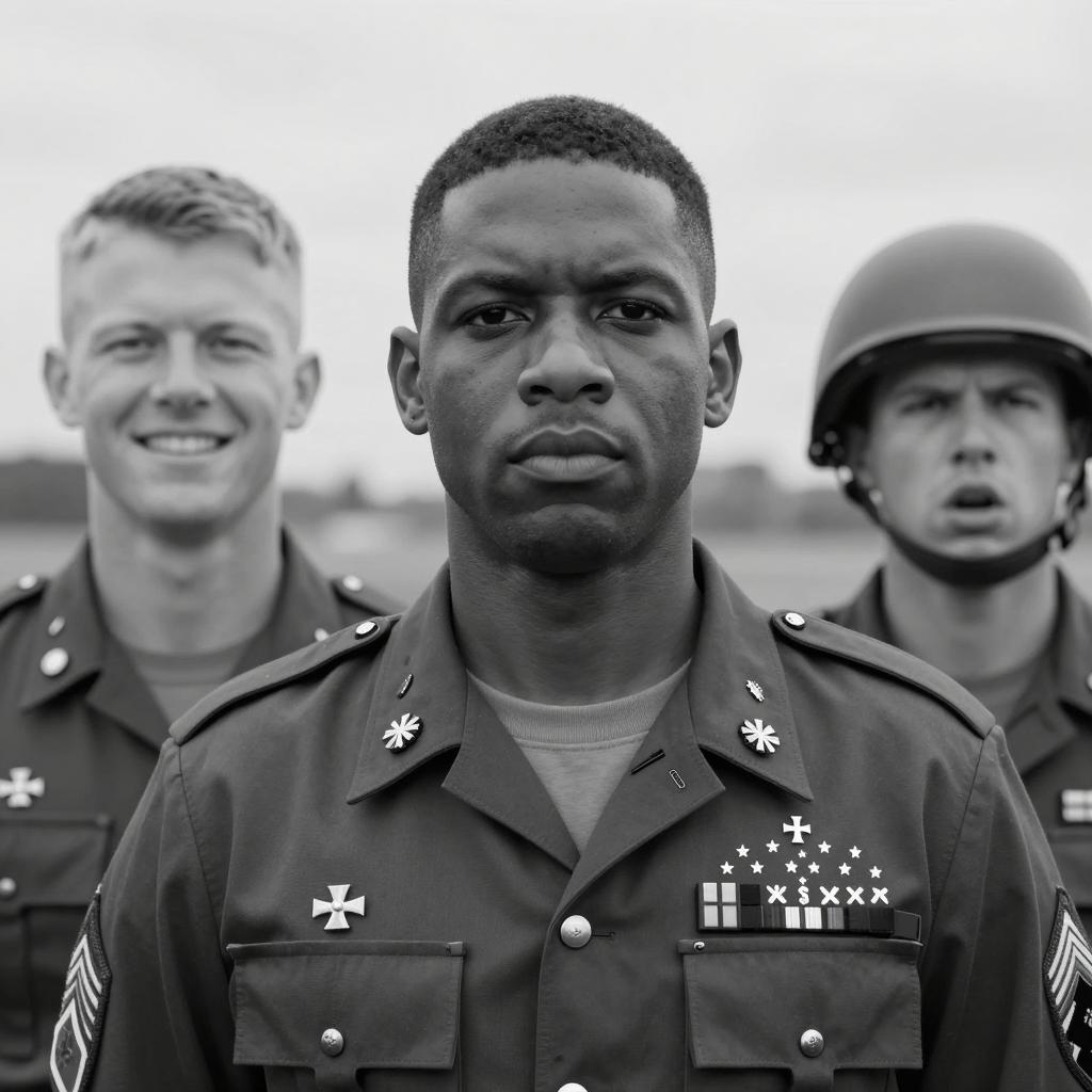 Black and white photograph of three men. Central figure is a Black man with short hair, serious expression, wearing a military uniform with rank insignia. Left: White man with short, light-colored hair, smiling, wearing a similar uniform. Right: White man in a helmet, open mouth, intense expression, also in a military uniform. Background is blurred.
