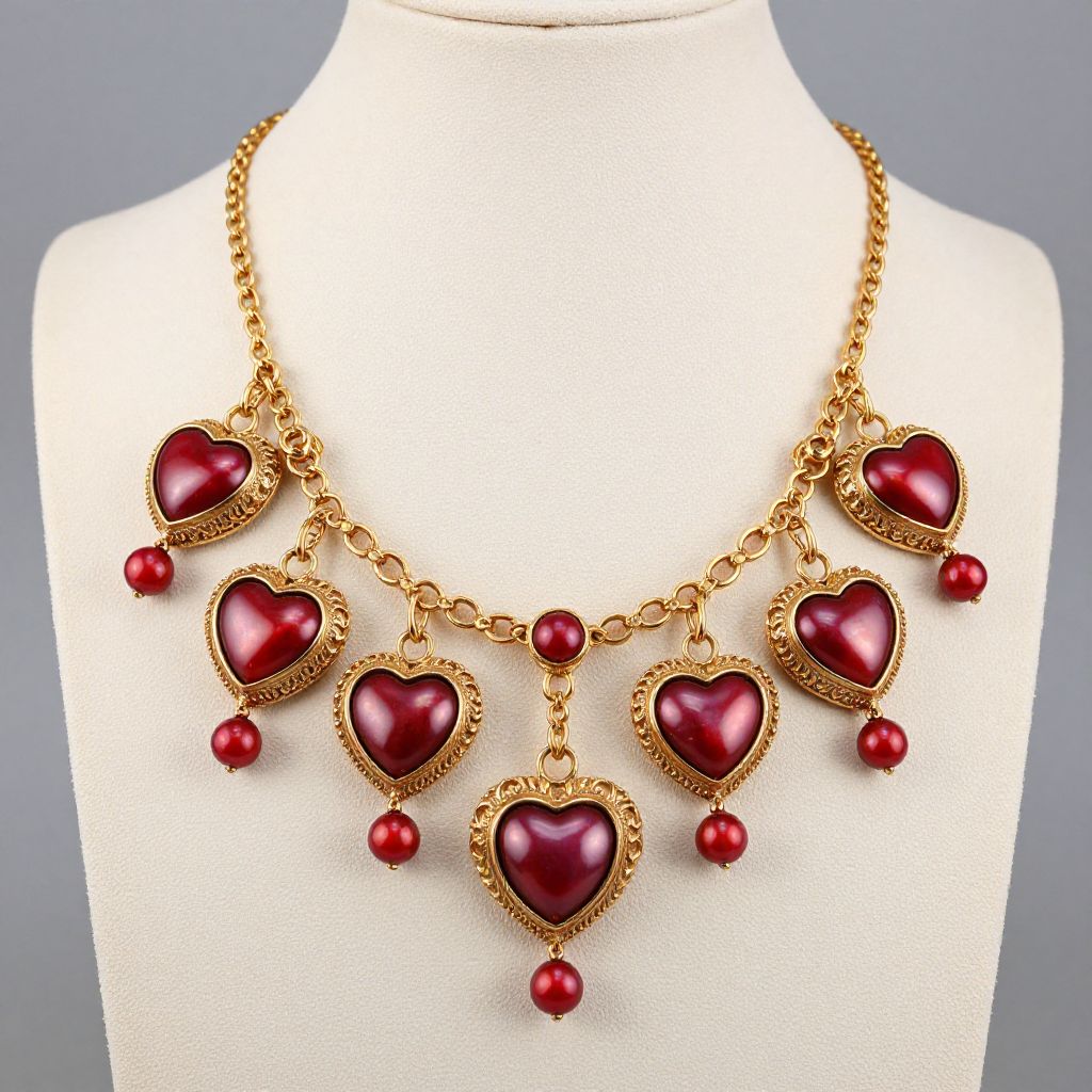 Elegant Antique Gold Heart Red Pearl Chandelier Necklace showcasing seven intricately designed heart-shaped pendants, each encased in a gold frame and adorned with dangling red pearls, elegantly displayed on a mannequin neck.