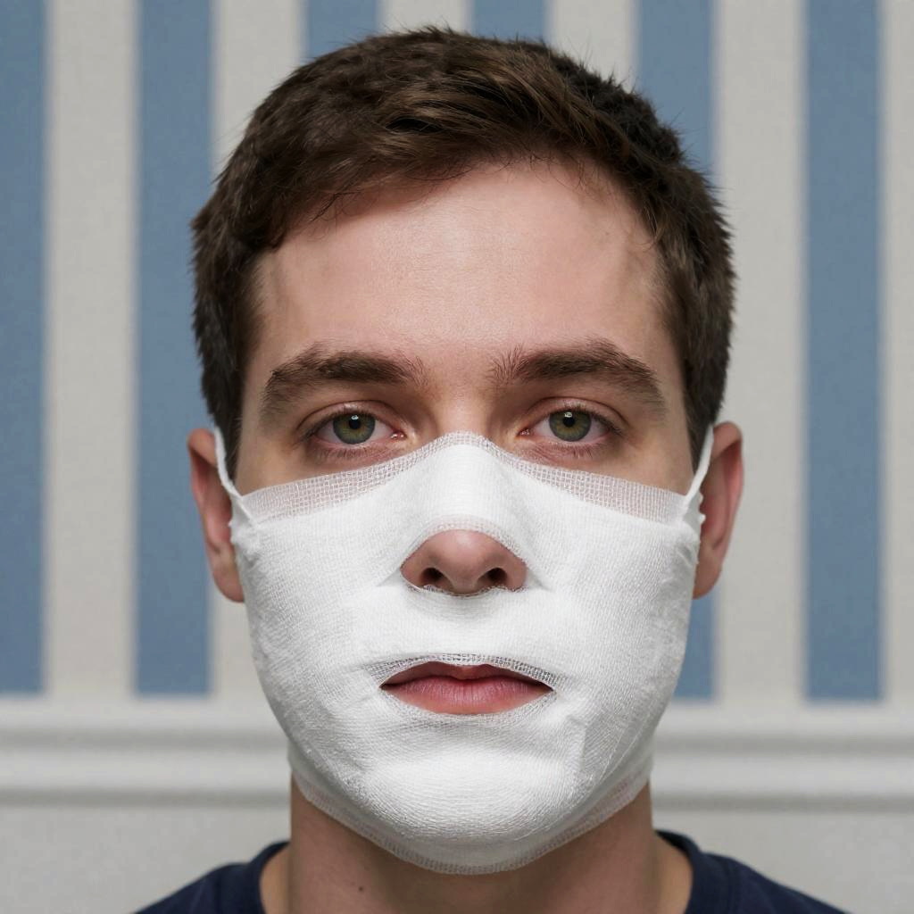 Close-up photograph of a man with pale skin, brown hair, and green eyes. His face and chin are covered in thick, white, crumpled gauze. He has a neutral expression. Background: blue and white striped wall with a white baseboard. The man is centered in the image.