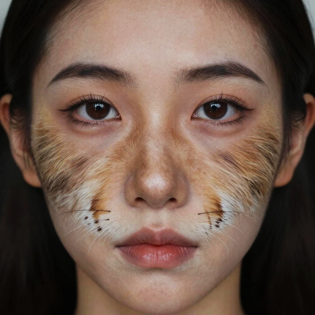 Realistic animal makeup on a human face, intricate details with lifelike fur textures and natural shading, blending seamlessly with skin tones, close-up portrait, soft studio lighting, hyper-realistic style, emphasizing eyes and whiskers