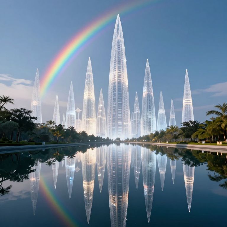 Photograph of futuristic, glowing skyscrapers with reflective water pool, palm trees, and vibrant rainbow against clear blue sky.