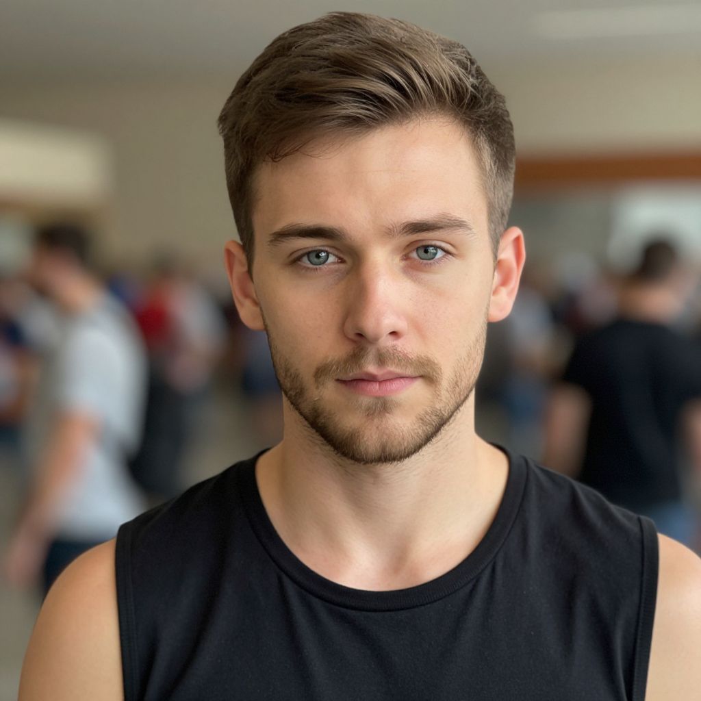 Gender bender costume guy, 1boy, solo, male focus, realistic, looking at viewer, brown hair, blurry background, upper body, blurry, sleeveless, shirt, facial hair, blue eyes, photorealistic