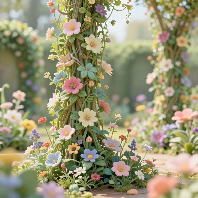 Text prompt formed by intertwining vines and flowers, lush botanical garden scene, bright natural daylight, detailed flora patterns, whimsical fantasy style, soft pastel colors and gentle bokeh background, ethereal and dreamy mood.
