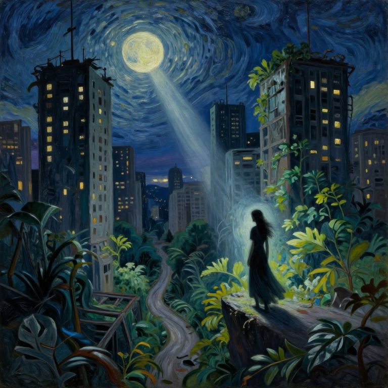 A captivating oil painting immerses viewers in the tranquility of a moonlit night, set against an enigmatic cityscape where nature harmoniously coexists with urban decay. Towering skyscrapers stand alongside lush, thriving foliage, embodying a unique fusion of industrial and natural elements. An alluring female wanderer, her face veiled by shadows, navigates the labyrinthine paths of this forgotten metropolis under otherworldly beams of light. She stands on the precipice overlooking the distant horizon, adding to the aura of mystique. The painting masterfully conveys both tranquility and desolation, evoking a profound emotional connection through innovative color and texture reminiscent of Van Gogh's style, inviting audiences into a dreamlike realm where dreams and nightmares entwine.