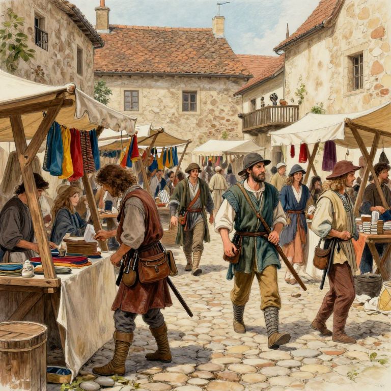 This digital painting depicts a bustling medieval marketplace on a cobblestone street. Men and women, dressed in period clothing with tunics, vests, and hats, browse and barter at wooden stalls adorned with colorful fabrics and goods. The stone buildings in the background have red-tiled roofs and small windows. The stalls are shaded by beige canopies. A man with a beard and brown vest stands in the foreground, holding a staff. Women in long dresses and men in breeches and shirts engage in conversation and transactions. The scene is lively, with vibrant colors and detailed textures capturing the historic ambiance.