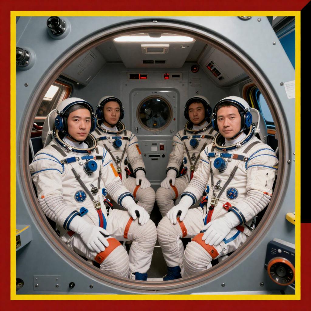 Photograph of four male astronauts in white flight suits with black harnesses, seated in a spacecraft cockpit. The cockpit has a dome-like window with a man's head visible outside. The background is metallic with control panels. The image has a red border with yellow and black .