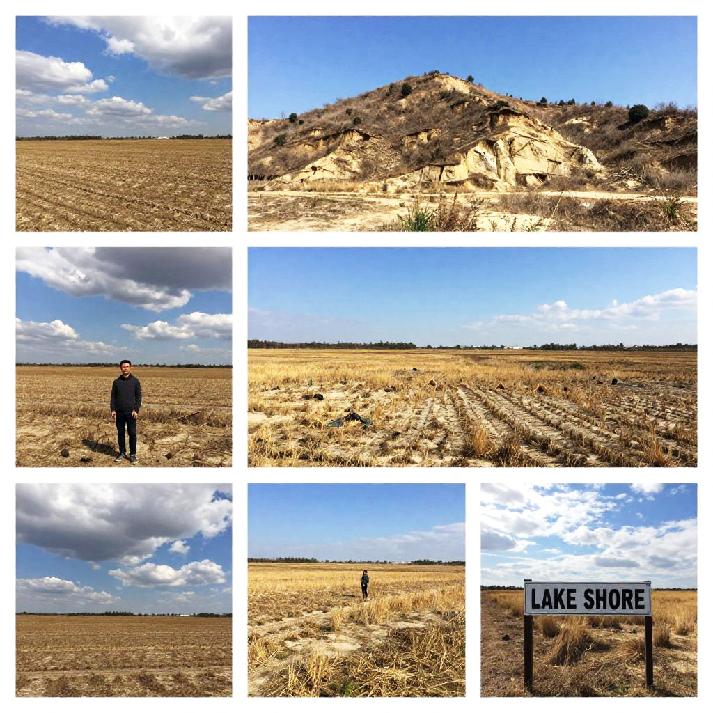 This is a collage of five photographs showing different outdoor scenes. The top-left image shows a dry, tilled field under a partly cloudy sky. The top-right image features a large, eroded hill with sparse vegetation. The bottom-left image has a person standing in a barren field with dark clouds. The bottom-middle image shows a vast, sunny field with a person in the distance. The bottom-right image includes a signpost with "LAKE SHORE" in the foreground, with dry grass and a bright sky in the background.