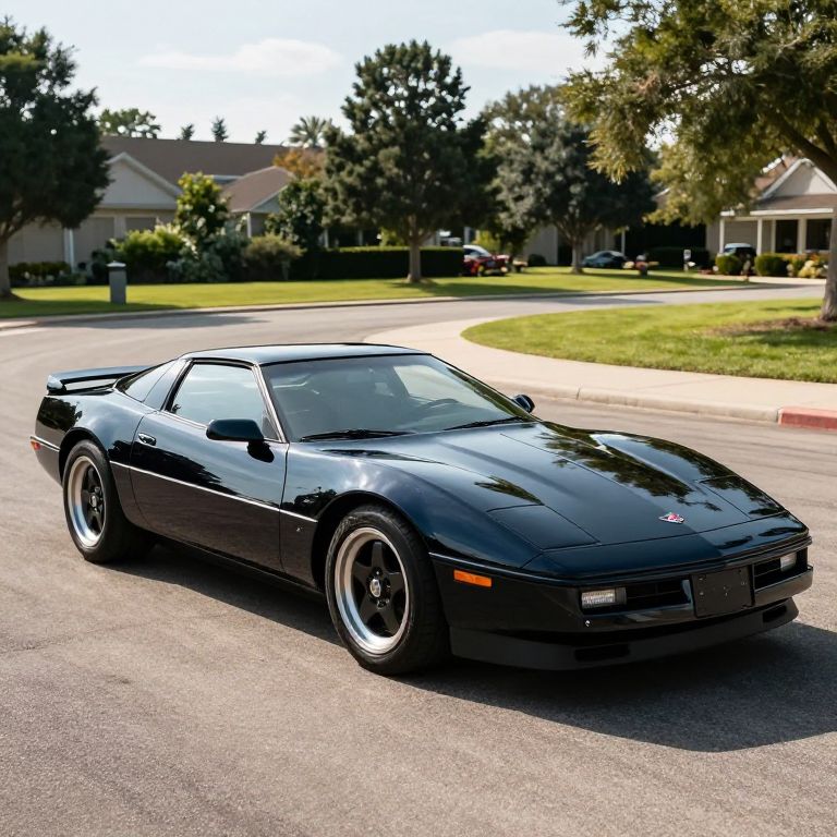 Photograph of a sleek, black, late 1980s or early 1990s Nissan 300ZX parked on a suburban street. The car has a glossy finish, white racing-style wheels, and a prominent rear spoiler. The background features a sunny day with clear skies, green grass, and trees, and suburban houses with light-colored exteriors and manicured lawns. The street is curved, and the car is positioned slightly angled to the left, showcasing its aerodynamic design and shiny surface. The image has a high-contrast, vibrant style, enhancing the car's sleek appearance against the bright outdoor setting.