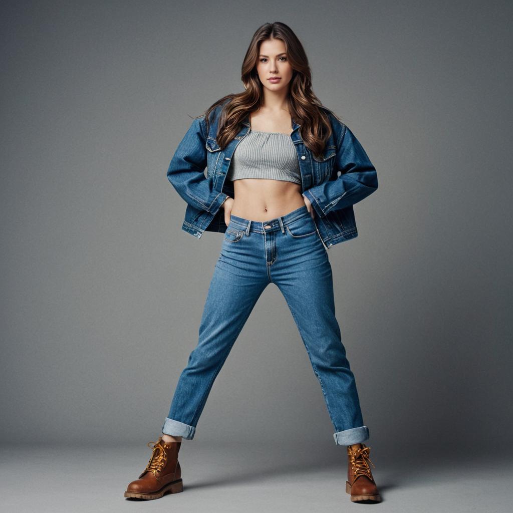 Paperbag jeans costume,1girl, solo, brown hair, long hair, midriff, pants, clothes around waist, navel, full body, jacket, denim, standing, brown footwear, realistic, grey background, looking at viewer, brown eyes, blue pants, lips, jeans, crop top, tube top, shirt