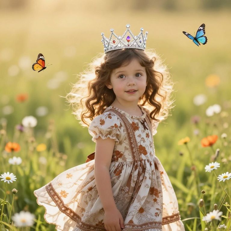 A young girl with soft, curly brown hair that gently falls over her shoulders and bright, curious eyes that sparkle with wonder stands in a sunny meadow bathed in golden light. She wears a delicate brown and white dress with intricate floral patterns, the fabric flowing softly in the breeze. On her head rests a sparkling silver crown adorned with tiny gemstones that catch and refract the sunlight, glowing like stars in the morning air. Around her, daisies bloom in vibrant colors and butterflies flutter gracefully, their wings catching the sunlight. The scene is warm, whimsical, and full of magic, evoking a sense of innocence, joy, and enchantment — as if she is the heart of a fairy-tale world.