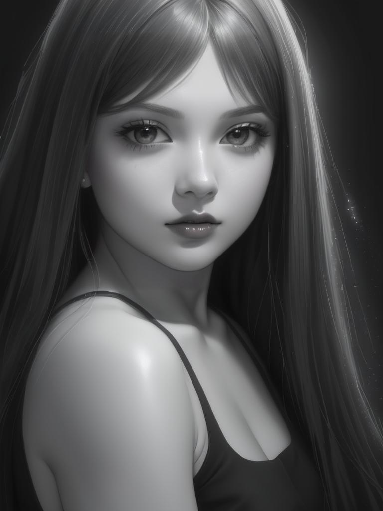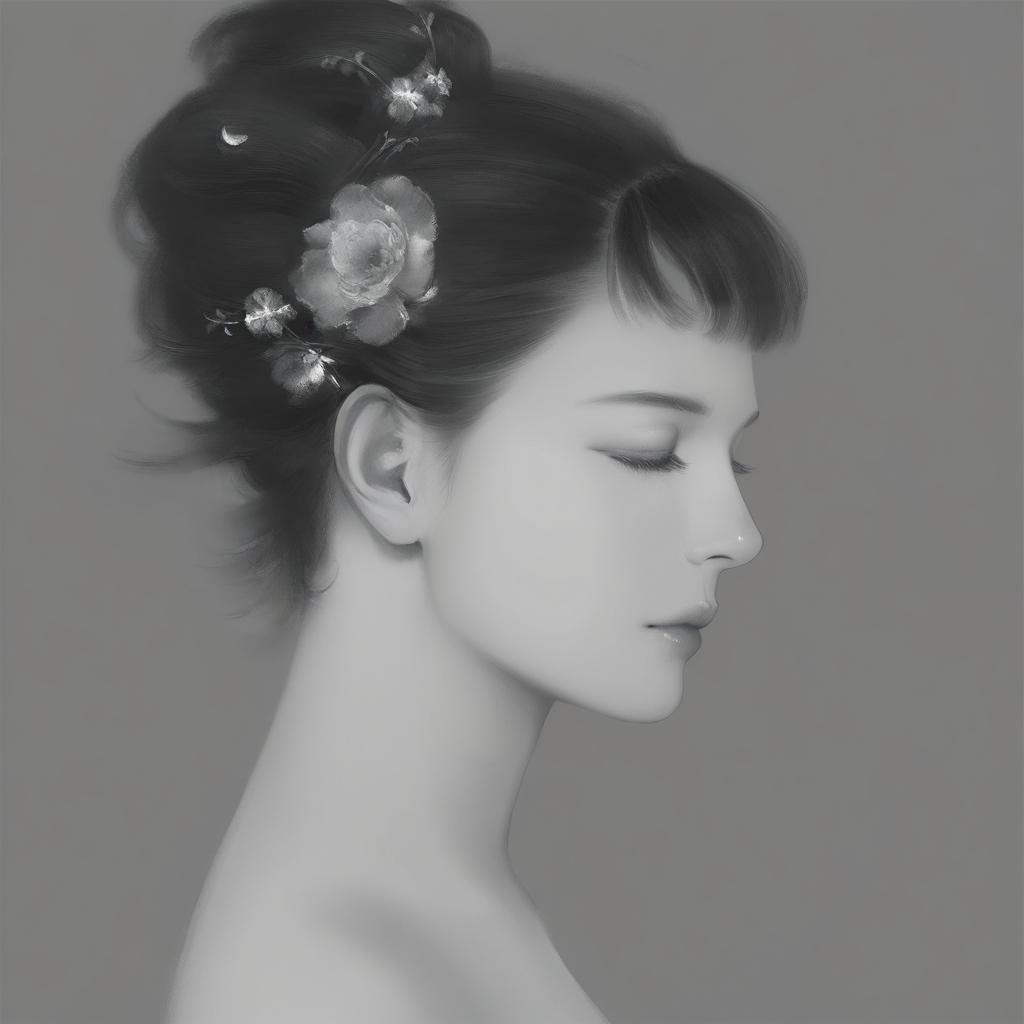 1girl, solo, realistic, monochrome, greyscale, hair bun, single hair bun, photorealistic, upper body, lips, nose, nude, looking at viewer, gradient background, closed mouth, hand up, bare shoulders, simple background, short hair, grey background