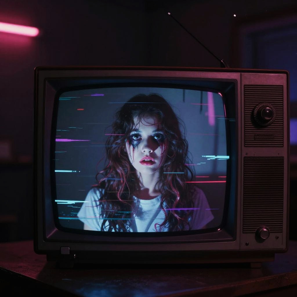 Analog horror girl trapped inside old TV screen, glitching pixel distortions, dark empty room with flickering neon lights, vintage horror film style, unsettling and surreal