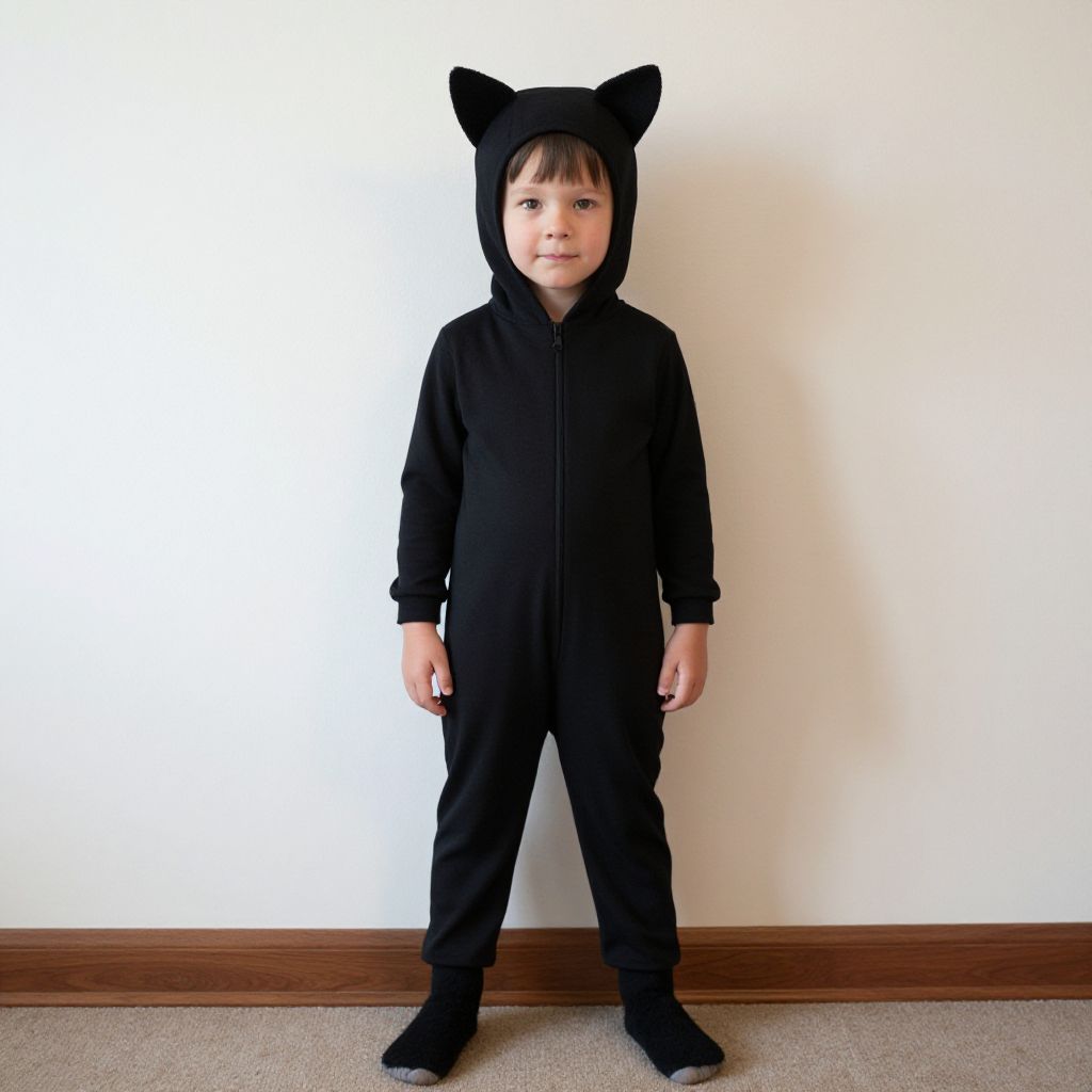 "Animal Costume Boy, boy in a black cat costume standing in front of a wall"