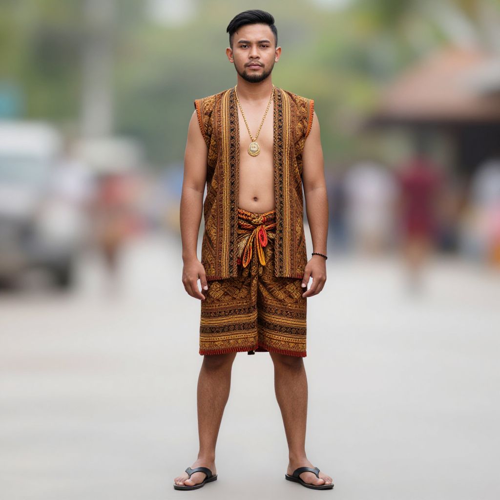 Photograph of a young, shirtless Asian man with short black hair, wearing black checkered pants, gold armlets, and bracelets, standing bare