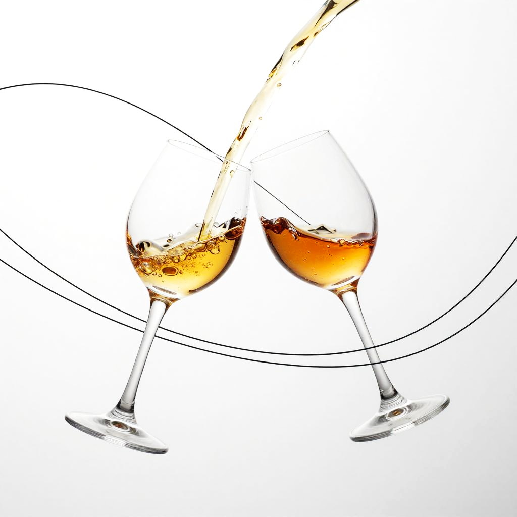 A digital art image featuring two elegant wine glasses tilted, with amber liquid gracefully cascading from one into the other. The background is stark white, making the glasses and liquid stand out. Black, curved lines add a dynamic, flowing effect. The glasses are positioned slightly to the left, with the liquid stream connecting them in the center. The overall style is modern and minimalist.