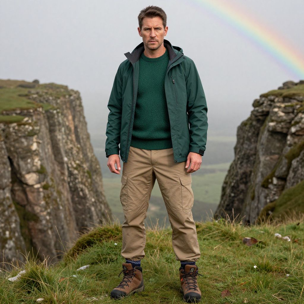 A man, wearing a forest green merino wool sweater, lightweight waterproof hiking jacket, durable khaki cargo pants, rugged brown hiking boots, breathable moisture-wicking socks, standing on lush green cliffs, misty rainbow arcs in the background, pinhole camera style, focused expression. Man has masculine face and piercing eyes