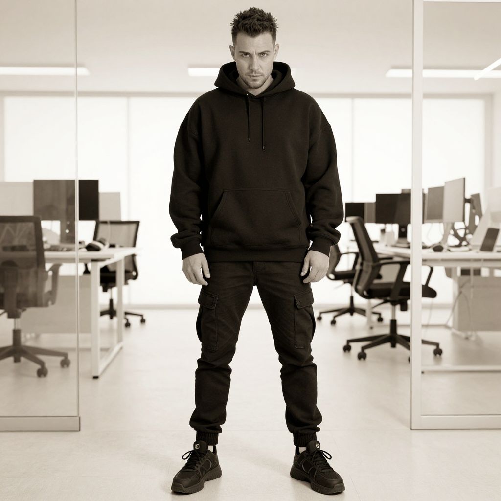 A man, oversized black hoodie, slim-fit black cargo pants, chunky black sneakers, cotton blend, matte finish, bright, open-plan workspace, glass walls, high-tech equipment, sepia effect, focused expressionMan has masculine face and piercing eyes