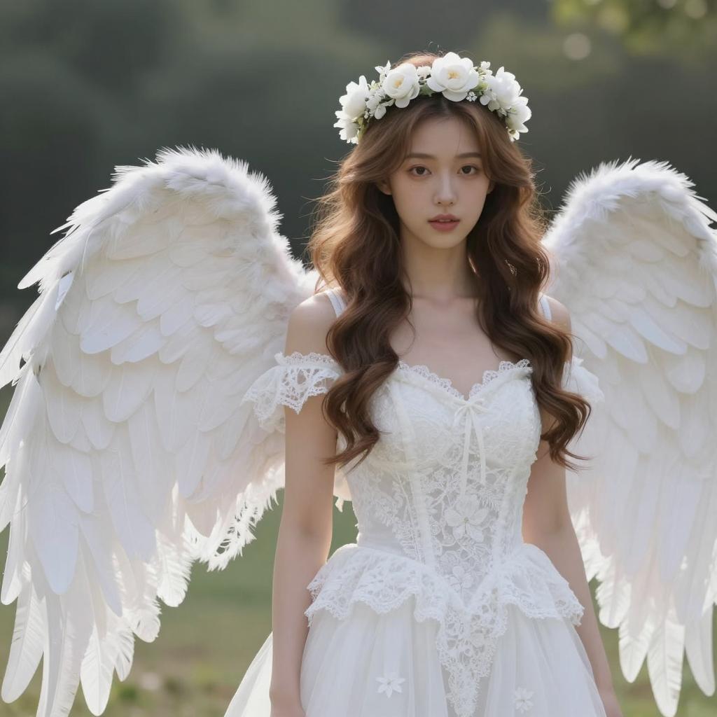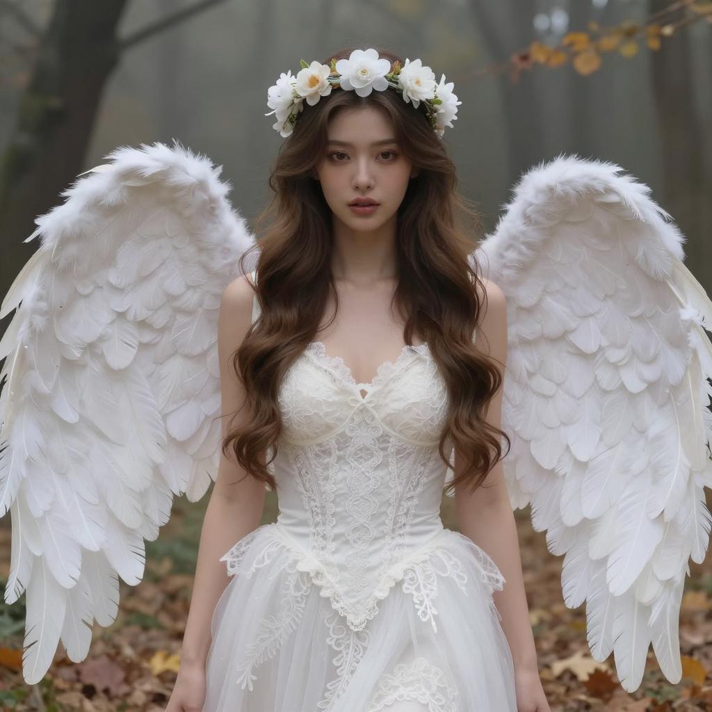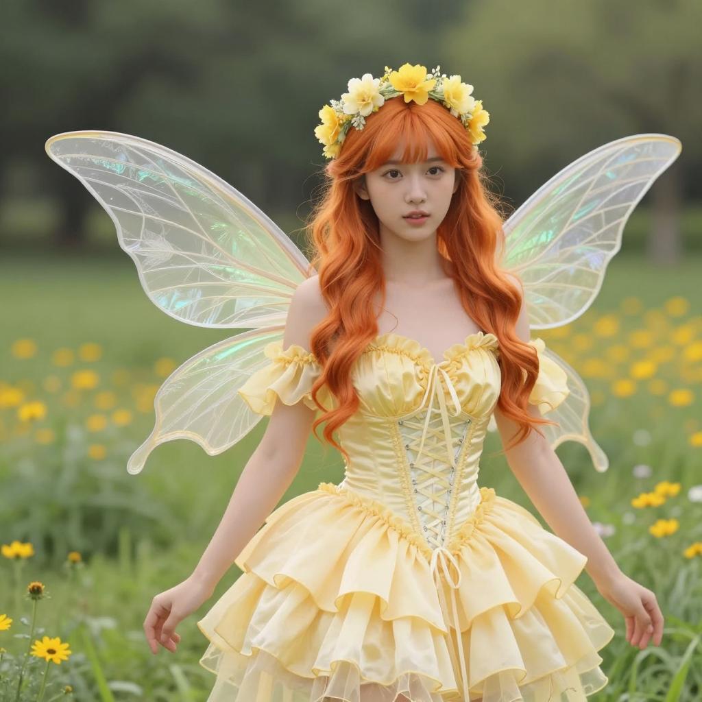 Tulle fairy wings, photorealistic fairy princess, standing in forest, daylight, long wavy brown hair, delicate flower crown, translucent fairy wings with sparkles, strapless golden corset top, light blue tulle skirt, slim and beautiful, fair skin, soft glowing light, soft-focus background, nature, ethereal, fantasy, realistic, detailed ures, natural light, magical, serene expression, fantasy character, enchanted forest