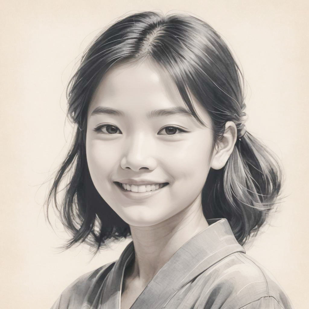 Portrait of an Asian girl with serene smile in charcoal sketch style against soft pastel gradient
