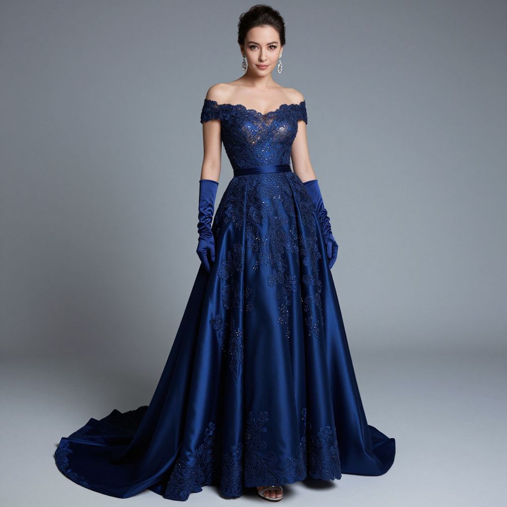 Photograph of a fair-skinned woman with dark, styled hair, wearing an off-the-shoulder, deep blue, lace-embellished, floor-length gown with a full skirt. She pairs the dress with matching elbow-length gloves and large, dangling earrings. She stands against a plain, light gray background, looking directly at the camera with a composed expression. The gown's intricate lace patterns add texture, while the satin fabric gives it a luxurious sheen. Her posture is upright, and her hands are relaxed by her sides. The overall style is elegant and formal.