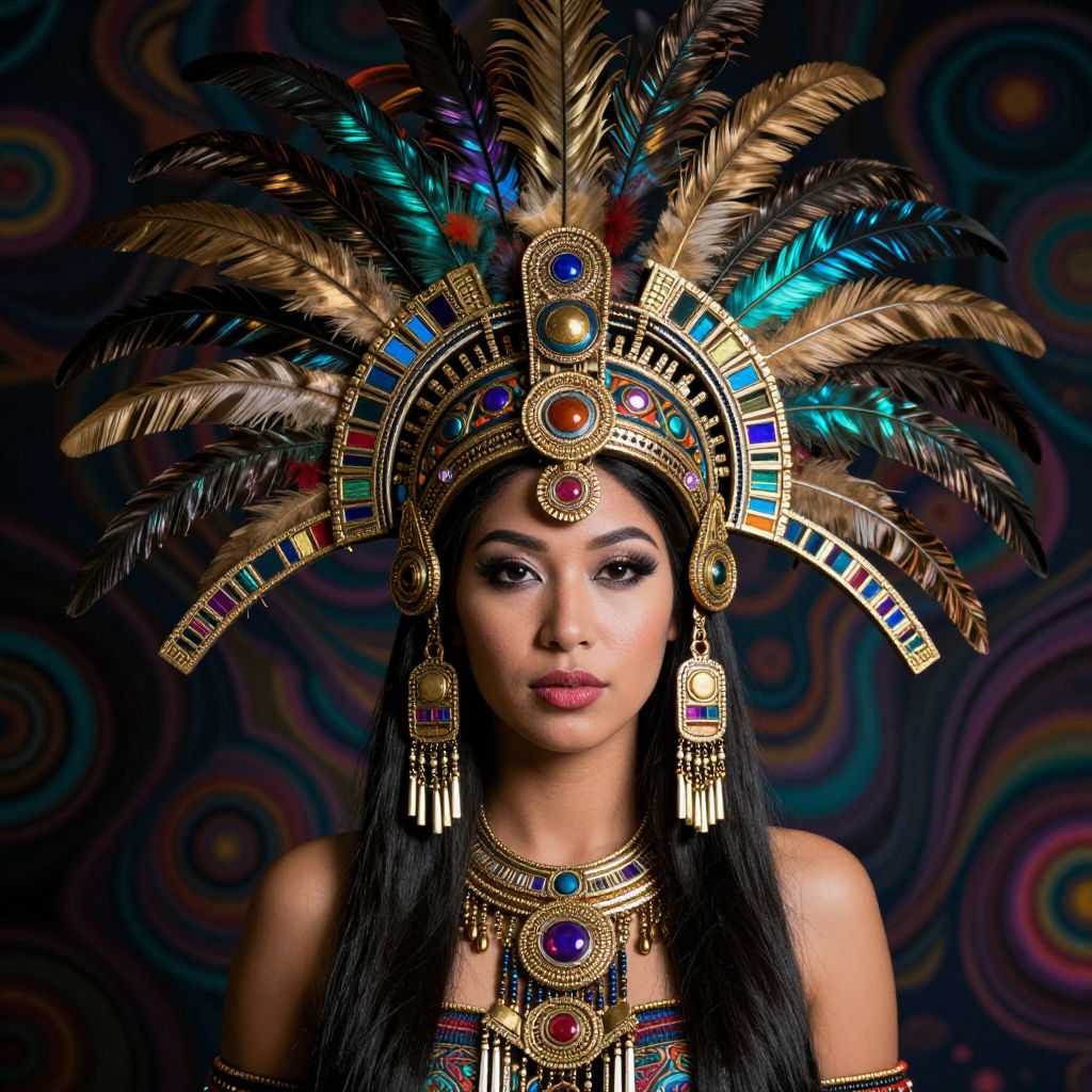 A woman in an elaborate Aztec-inspired headdress with iridescent feathers and intricate gold detailing, set against a dark, psychedelic background.