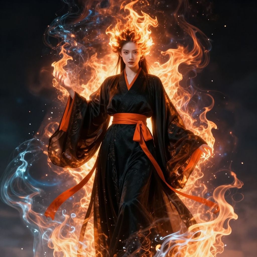 The image features a powerful female figure enveloped in flames and ethereal energies, symbolizing mastery over fire and water. Dressed in a striking black robe with a bold orange sash, she stands confidently against a dramatic backdrop of swirling elements, showcasing a blend of fantasy and artistry. This artwork captures the essence of strength and magic, making it a captivating visual representation.