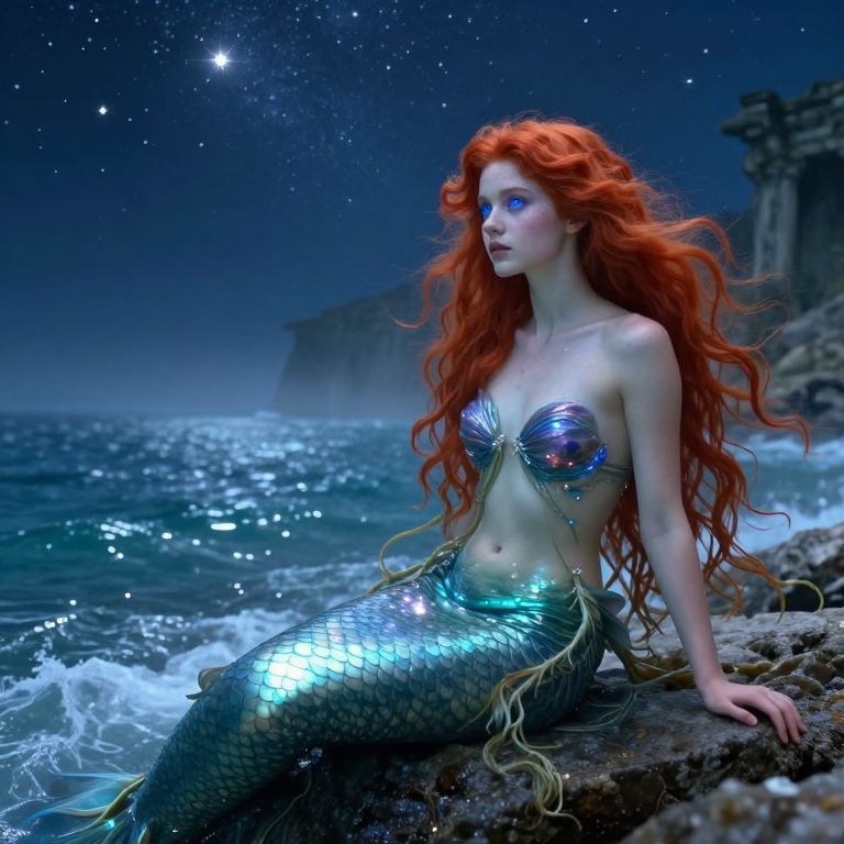 Craft an enchanting scene in the dreamy, ethereal style reminiscent of John William Waterhouse's artwork, featuring a captivating mermaid with flowing red tresses sitting gracefully on a rocky shoreline beneath a starlit sky. Her mesmerizing blue eyes reflect both celestial bodies and shimmering moonlight dancing upon tranquil ocean waves. The background showcases a misty landscape with ancient ruins, evoking a sense of timelessness and enchantment. Utilize photorealistic details to convey her translucent skin, intricate scale patterns, and flowing seaweed adornments, invoking a blend of awe, wonder, and melancholic longing as the viewer is drawn into the mysterious world of this enigmatic underwater princess.