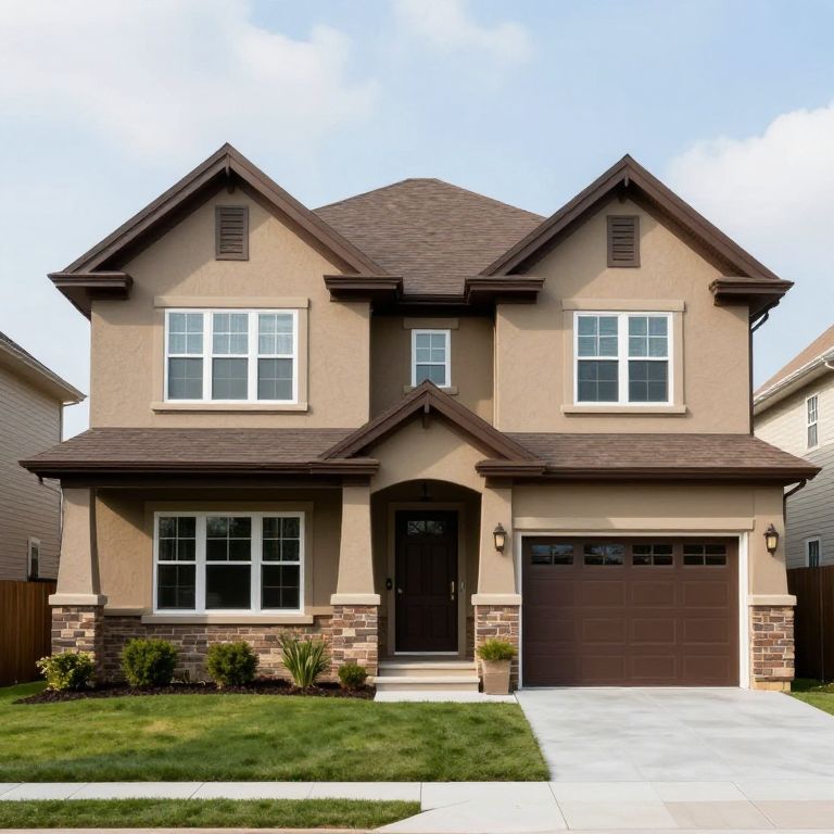 An exterior view of this house that features architecture, facade, home, house, property, real estate, brown