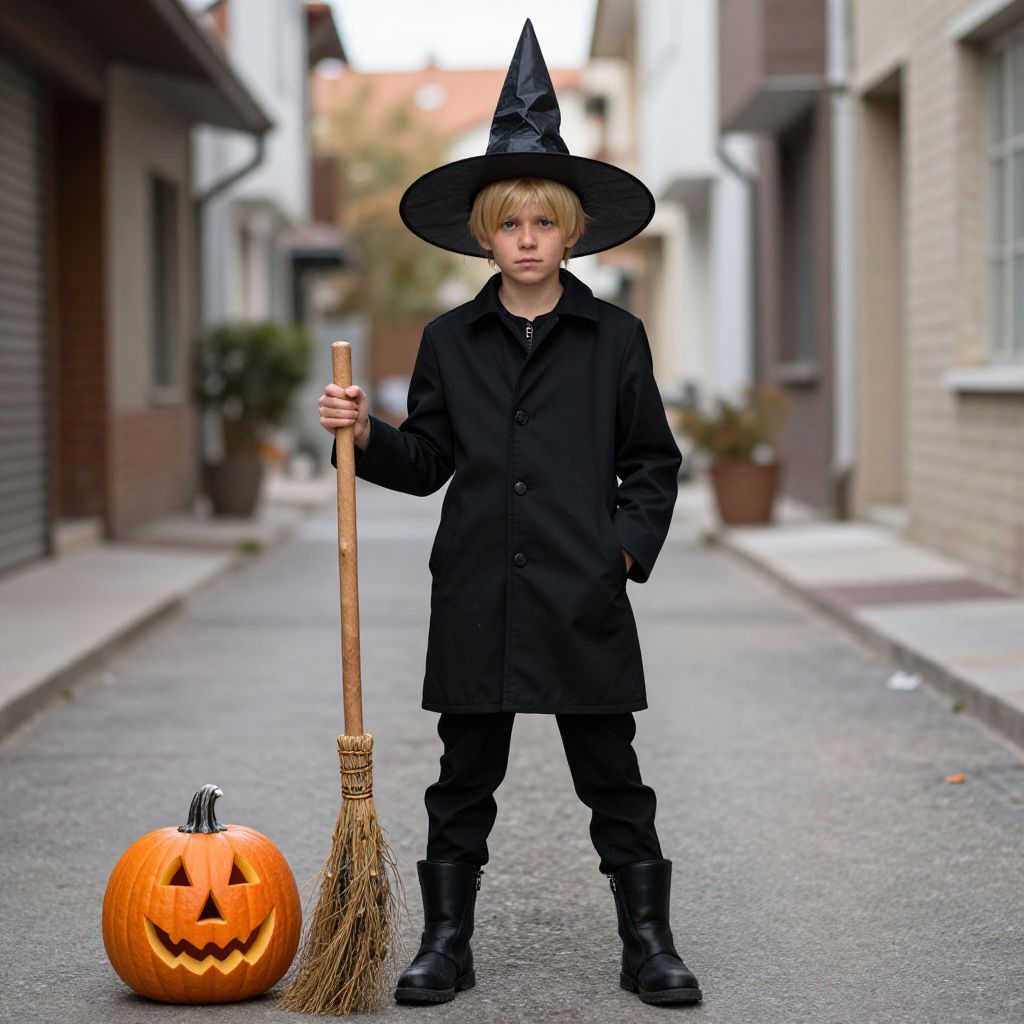 "witch pants costume, witch hat, hat, solo, outdoors, boots, halloween, black footwear, jack-o'-lantern, standing, hands in pockets, 1boy, broom, pants, looking at viewer, blonde hair, male focus, full body, coat, alley, black headwear Realistic photo of casual sexy person with pretty face"