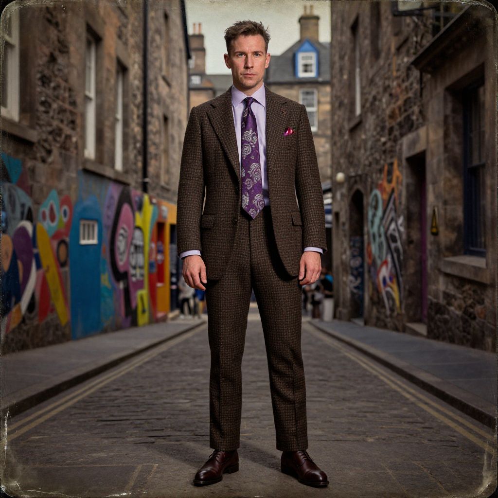Photograph of a young Caucasian man with short brown hair, standing confidently in the middle of a narrow, cobblestone alleyway. He is wearing a dark brown, checkered suit with a white dress shirt and a purple patterned tie. A red pocket square peeks from his jacket pocket. The alley is lined with graffiti-covered brick buildings, featuring vibrant colors like blue, yellow, and red. The background includes a slightly blurred, multi-story building with a blue roof. The man's black leather shoes are polished, and he stands with his hands relaxed by his sides. The image has a slightly vintage, Instagram-like filter with softened edges.