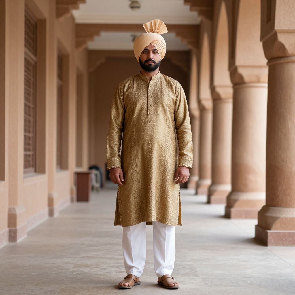 Photograph of a bearded man in a golden traditional Punjabi kurta, white pants, brown sandals, and beige turban, standing in a