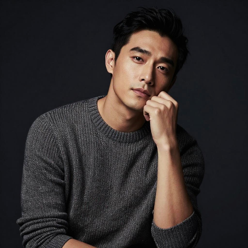 Photograph of an Asian man with short, dark hair, wearing a textured, gray, long-sleeve knit sweater. He is positioned against a solid black background, with soft lighting highlighting his face and upper body. His right hand is raised to his chin, fingers lightly touching his lips, giving a thoughtful expression. His skin tone is light, and he has a clean-shaven face. The image has a professional, studio-style quality with a focus on his contemplative demeanor and the texture of his sweater. The lighting creates subtle shadows, adding depth to the image.