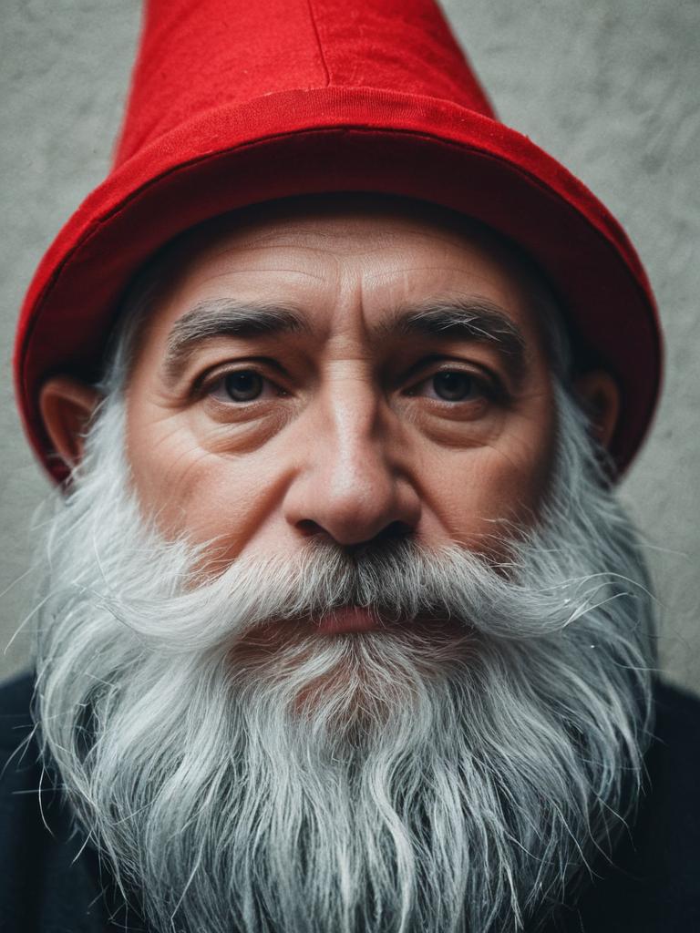 Person in Gnome Costume, close-up detailed headshot with red hat