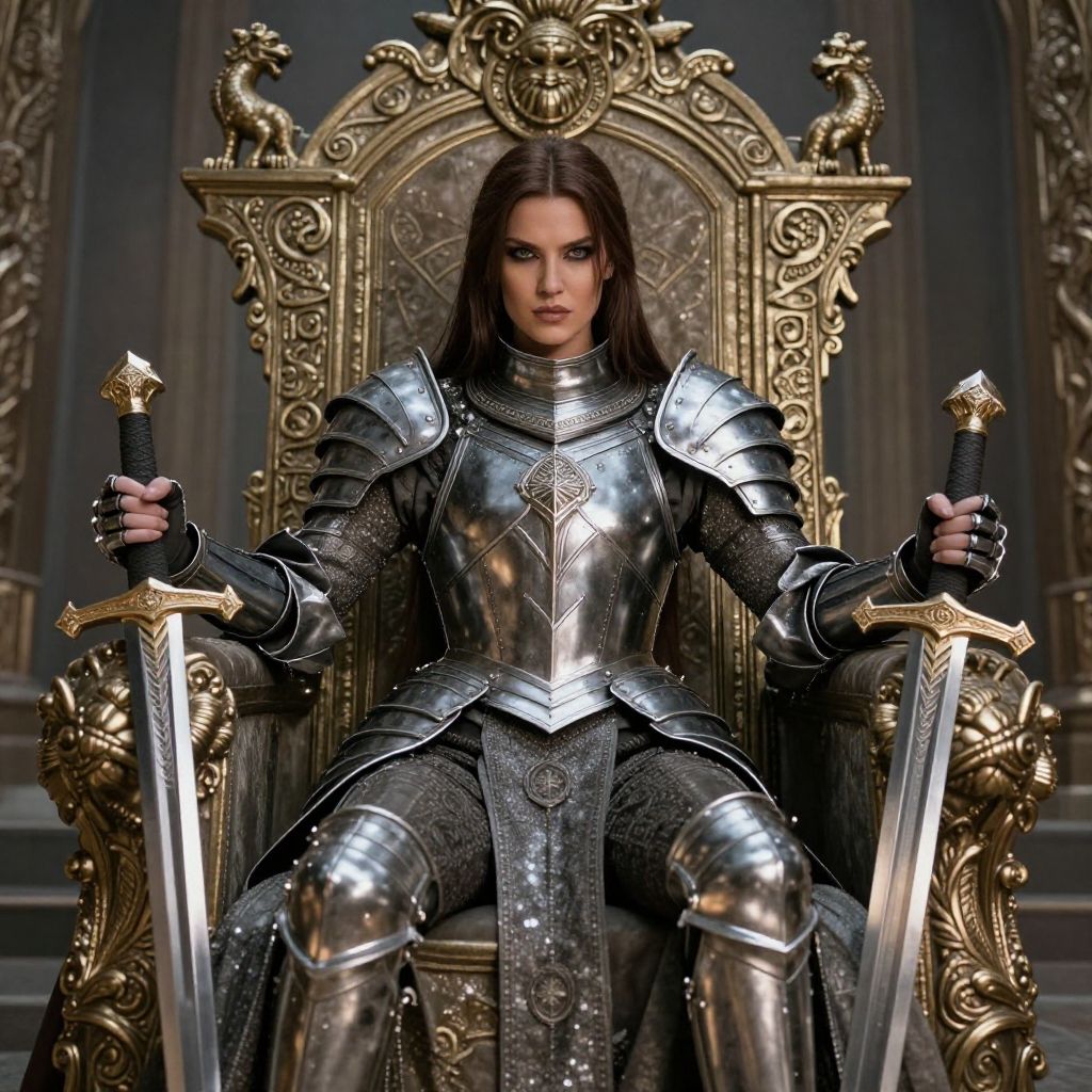A powerful warrior woman clad in ornate silver armor sits commanding on an intricately decorated throne, holding two swords with a fierce and confident expression. The image features a regal fantasy style with strong medieval and mythological influences, highlighting strength and authority in a dramatic composition.