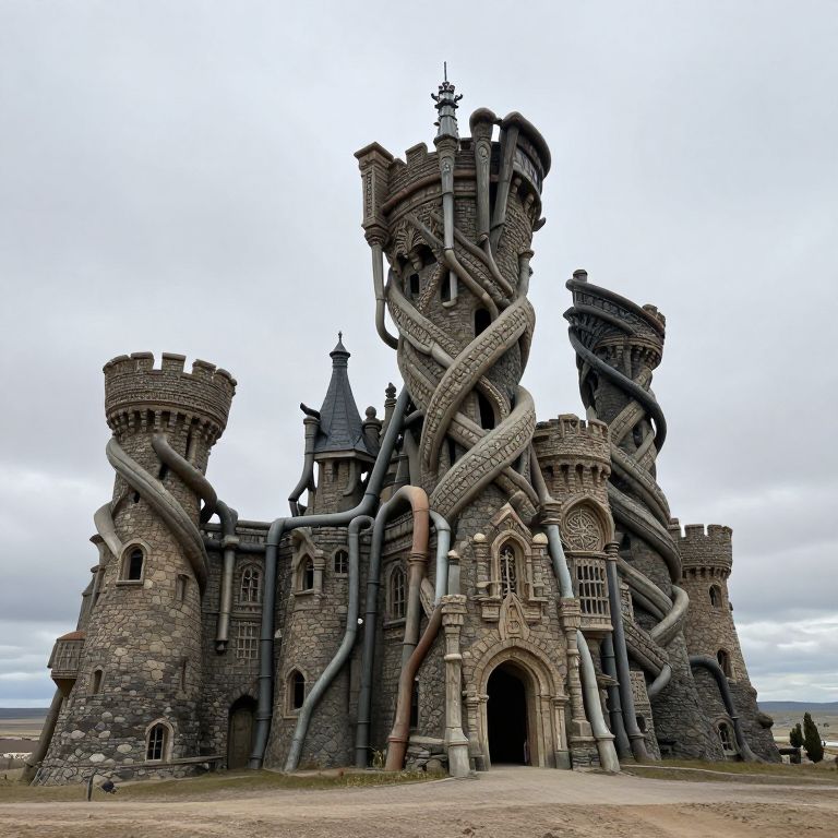 A fantastical, pipe-and-stone castle with intricate, twisted architecture stands in a barren landscape under a cloudy sky.