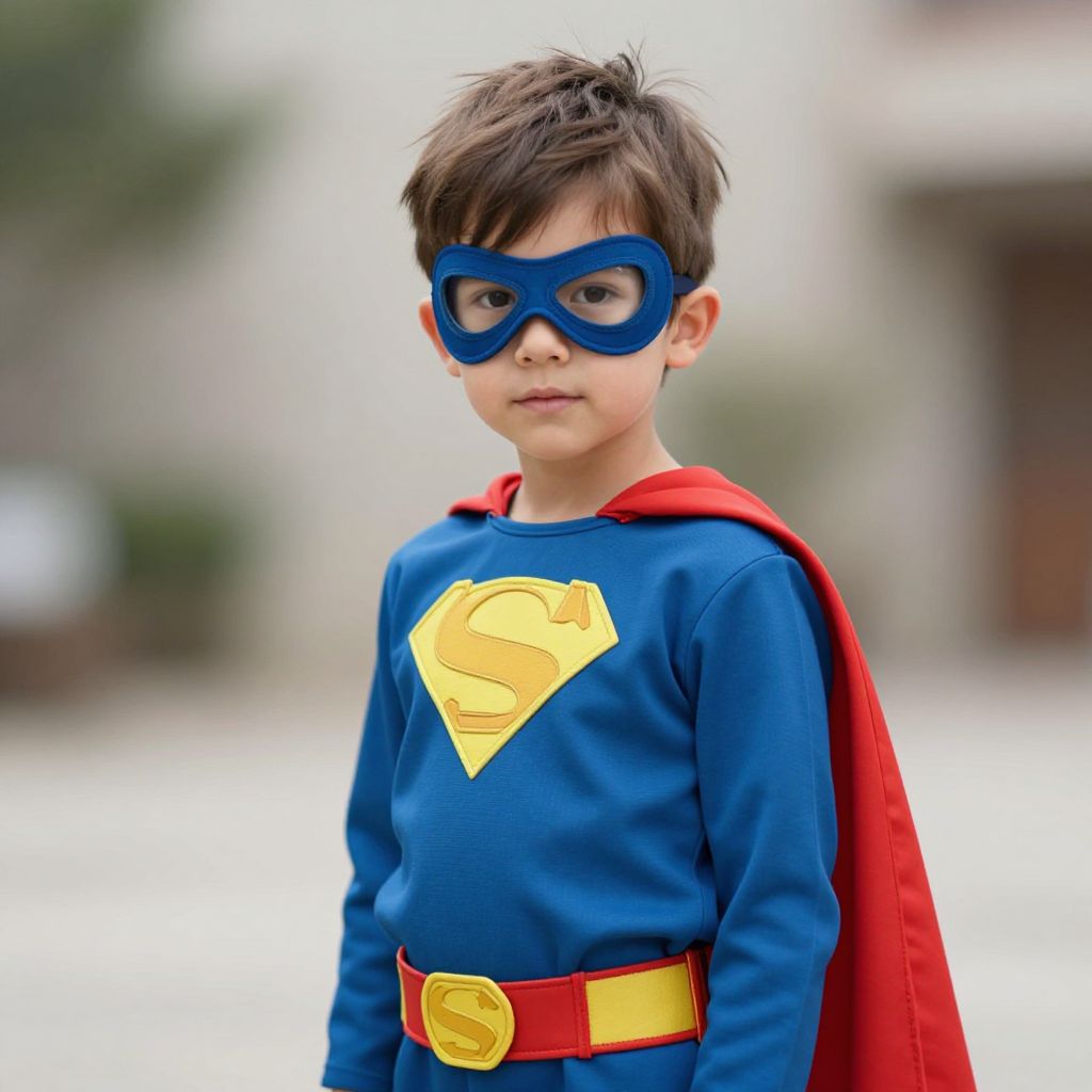Photograph of a young boy with light skin and dark, slightly messy hair, dressed as Superman. He wears a bright blue long-sleeve shirt with a yellow Superman emblem on the chest, a red cape draped over his shoulders, and a red belt with a yellow buckle. He also has blue eye mask and a serious expression. The blurred background shows an outdoor setting with greenery and a white building. The overall image has a soft, natural light.