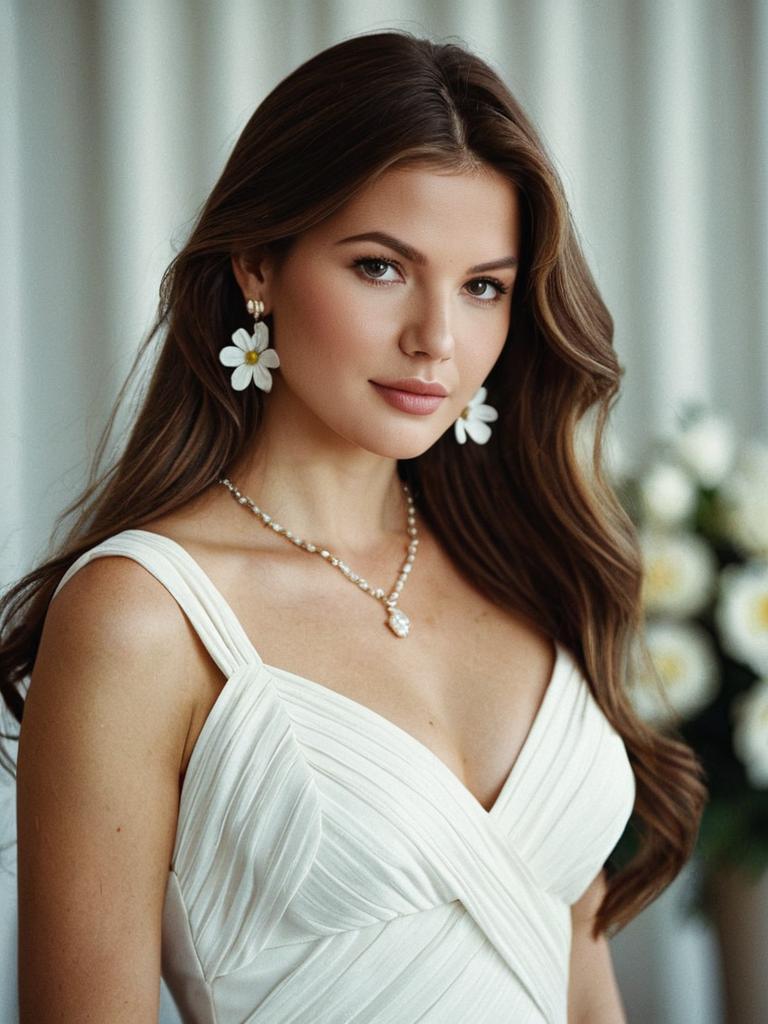 Photograph of a young woman with long, wavy brown hair and fair skin, wearing a white, sleeveless, V-neck dress with pleated detailing. She has white floral earrings and a delicate pearl necklace with a small pendant. Her makeup is subtle, emphasizing her natural beauty. The blurred background features white and yellow flowers and a light-colored curtain, creating a soft, elegant atmosphere. The woman's expression is calm and slightly smiling, with a confident yet gentle demeanor. The image has a soft, professional lighting that highlights her features and outfit.