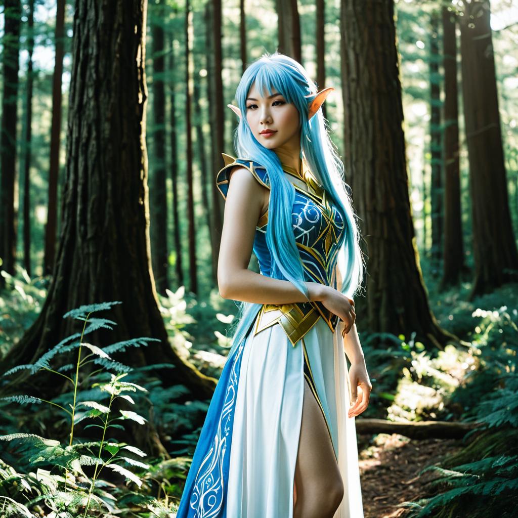 Green pokemon cosplay, photorealistic, young woman, forest background, green dress, leaf-inspired, green hair, elf-like ears, yellow flower accessory, long wavy hair, standing, sunlight filtering through trees, summer, fantasy character, detailed ures, natural light, beautiful, feminine, attractive, green color palette, detailed foliage, cosplay, ethereal, digital art