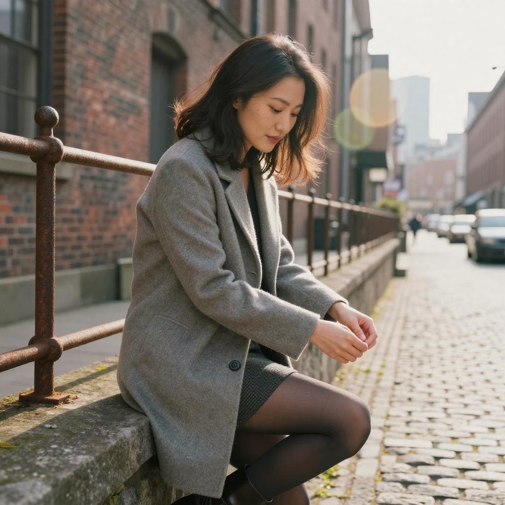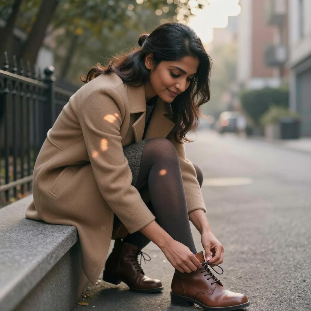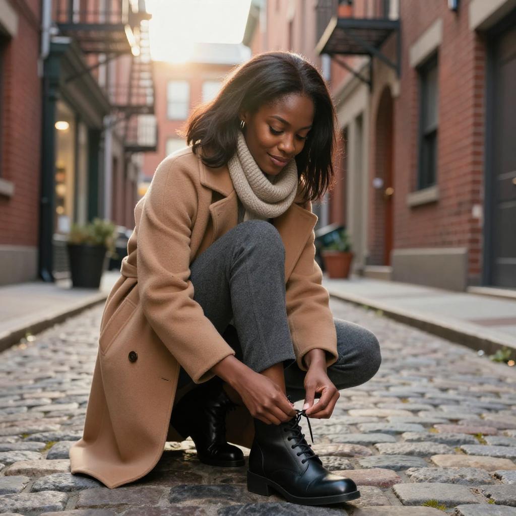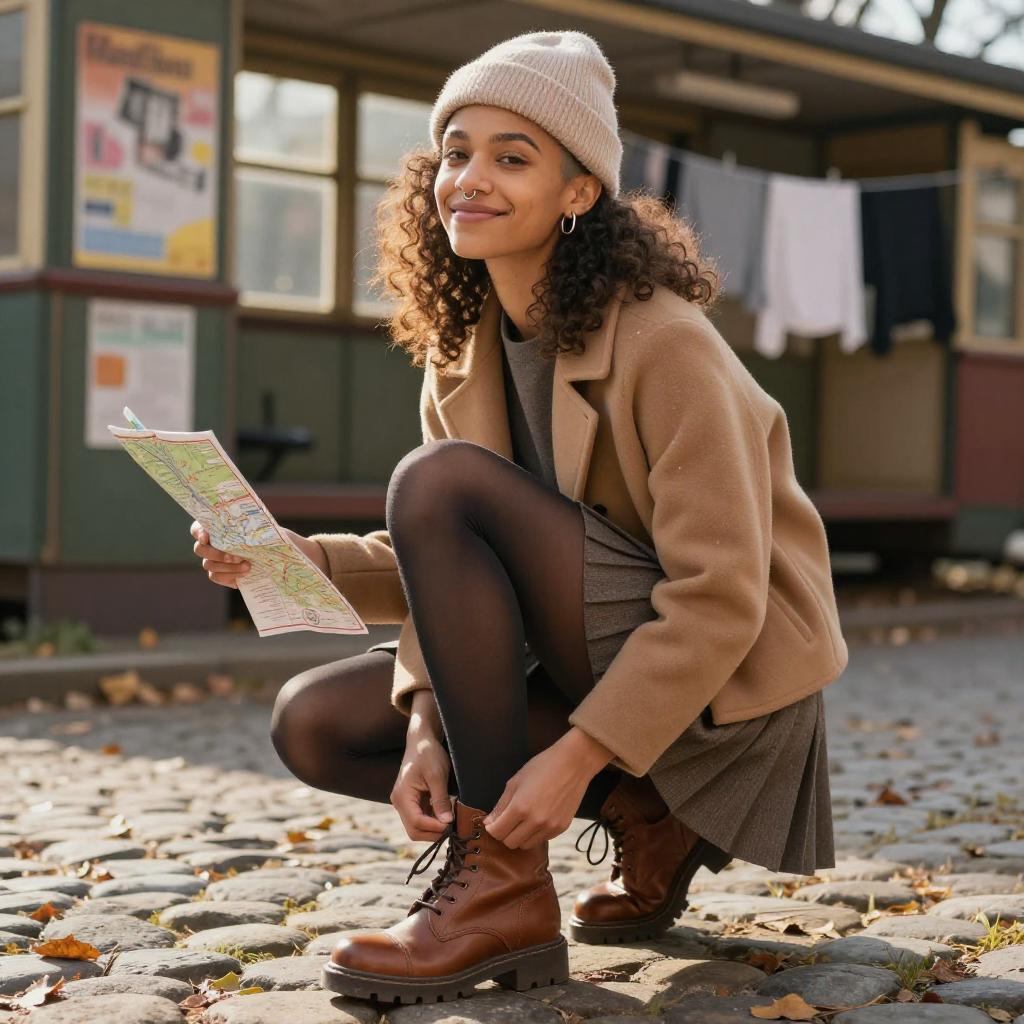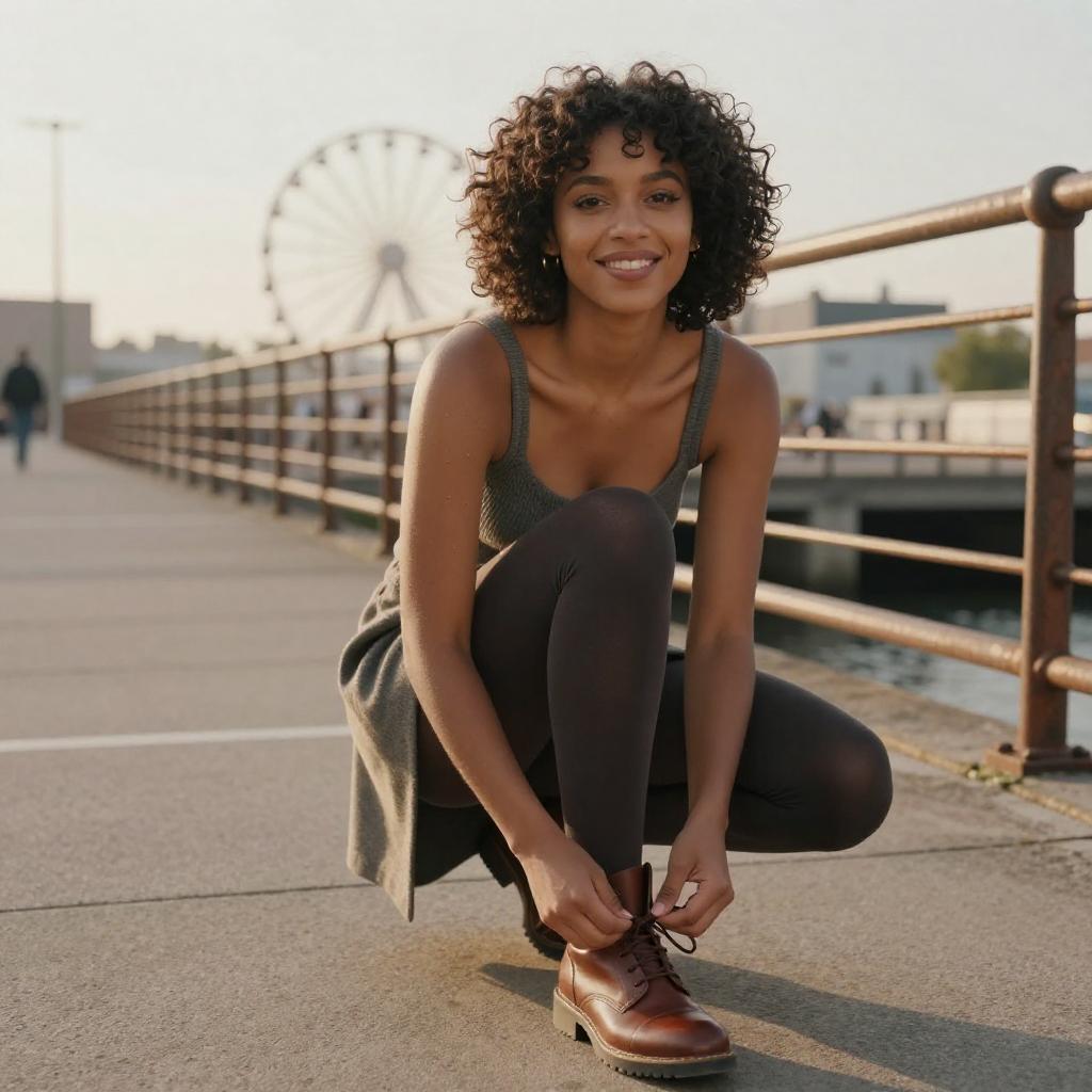 Young Afro-Latina woman in her late 20s with short natural curls and warm brown skin, squatting to tie a leather-boot lace with a closed-mouth smile and a subtle hint of goosebumps, in sunlit industrial waterfront promenade with textured concrete, weathered metal railings and a distant ferris wheel, soft lens flare and crisp golden light, wearing layered urban streetwear (wool skirt with opaque tights or tailored trousers, coat, leather boots), closed-mouth smile, subtle makeup, faint goosebumps in crisp golden sunlight, photorealistic, ultra detailed skin, uhd hdr 8k, dslr film photography, 35mm prime, shallow depth of field, film grain, studio quality optics, volumetric light, extremely detailed background, natural color grading, soft bokeh, editorial street photography vibe.