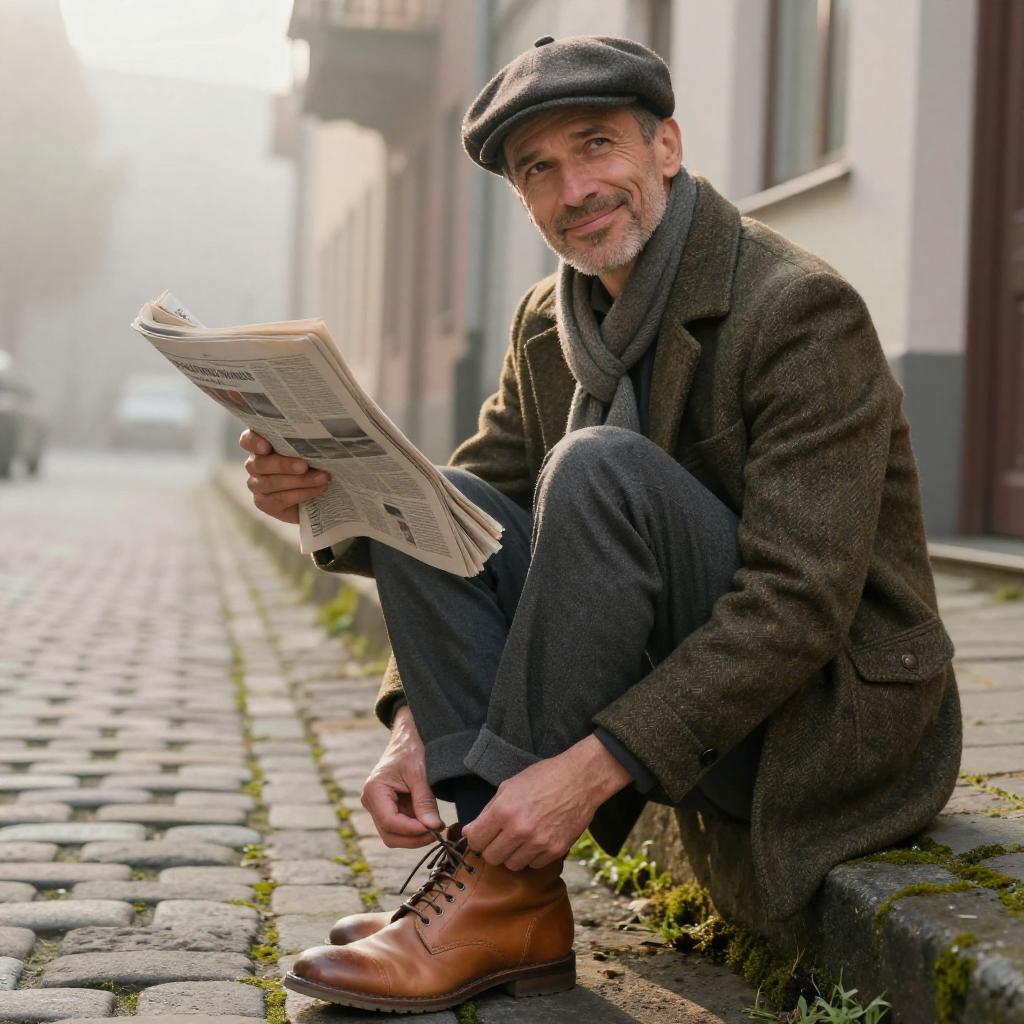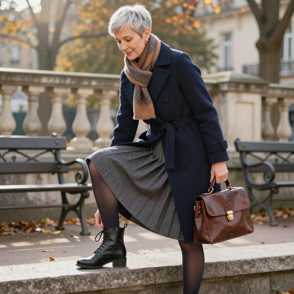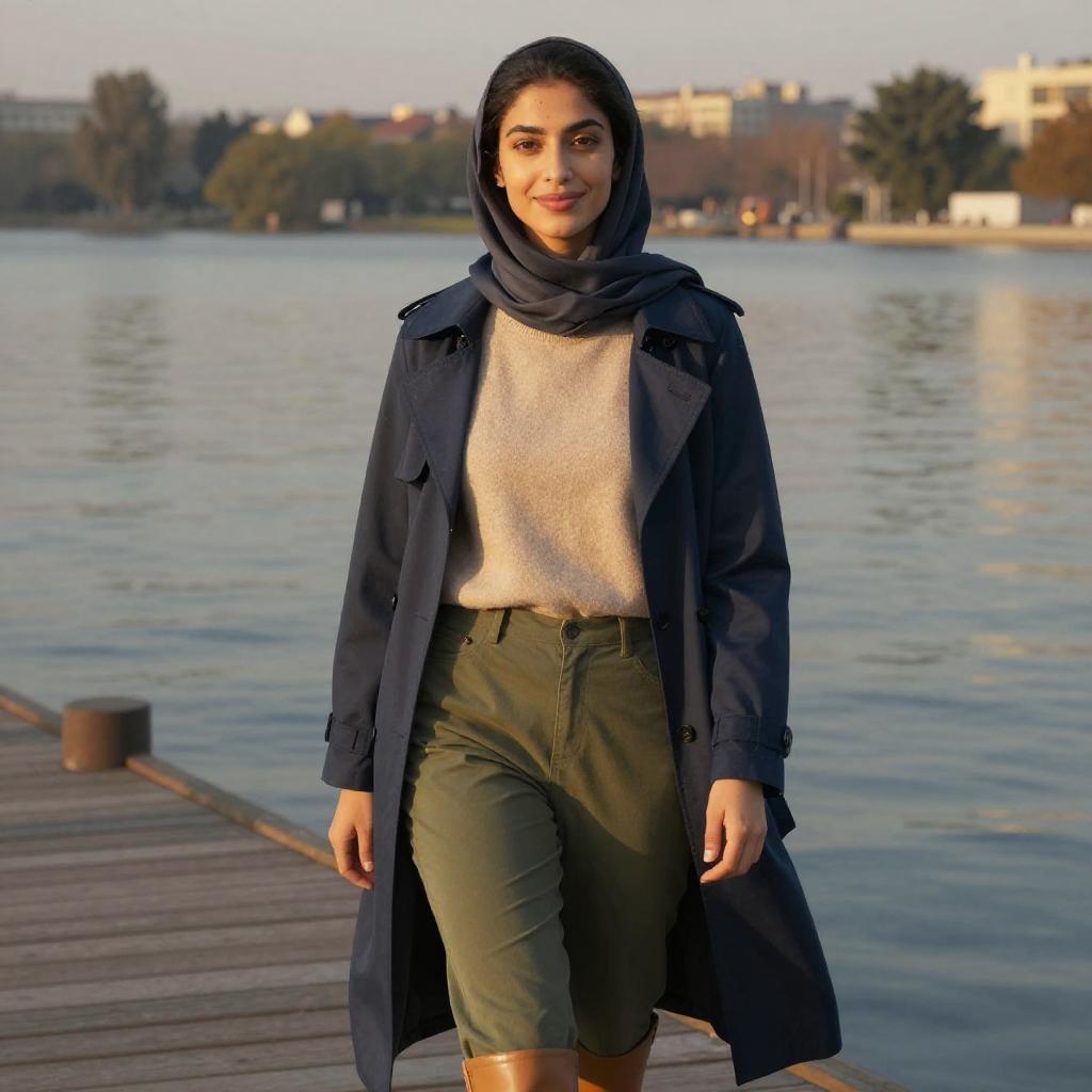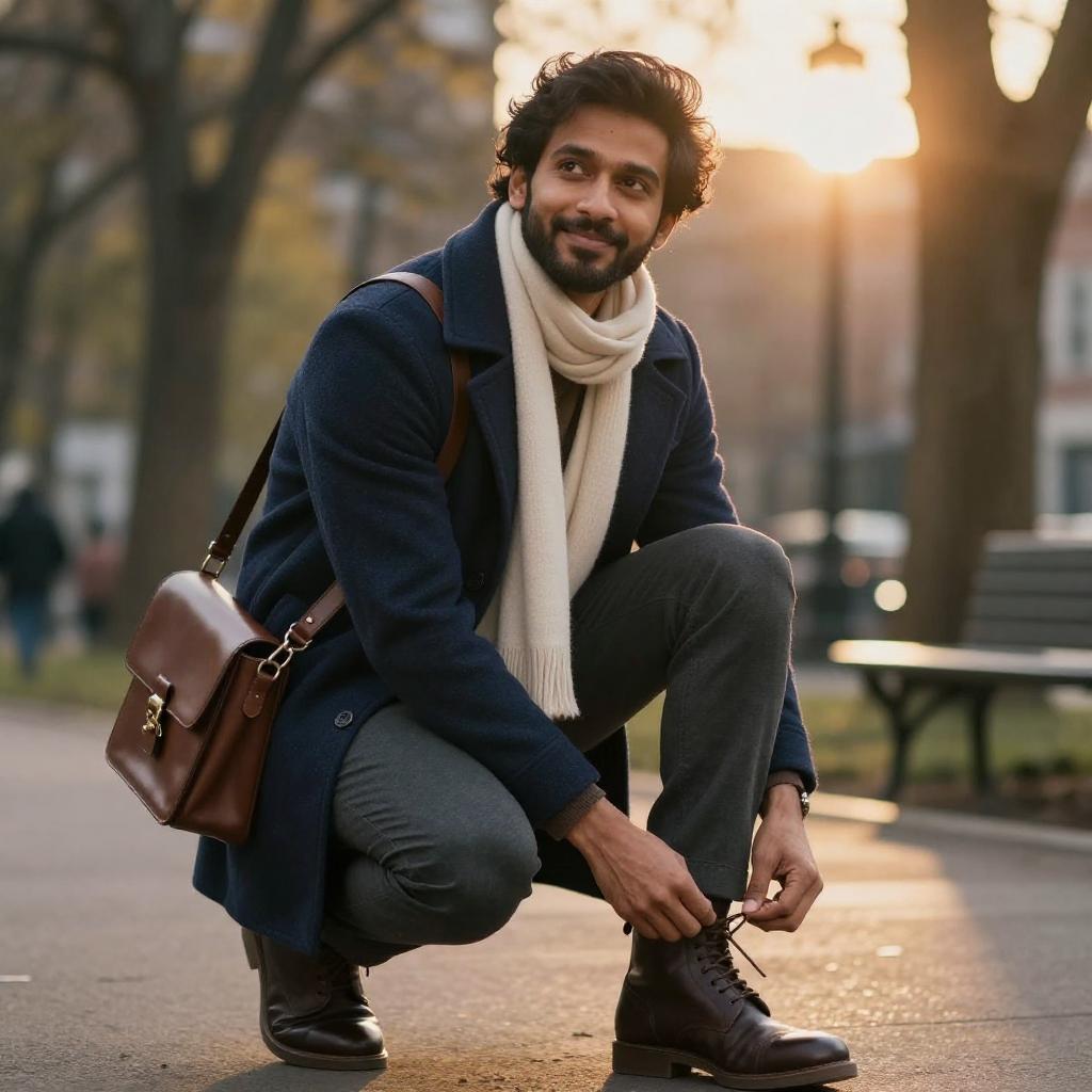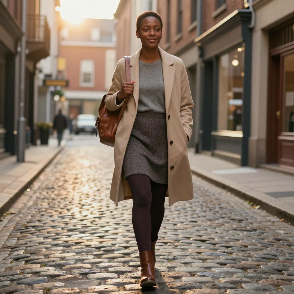 Young Afro-Latina woman in her late 20s with short natural curls and warm brown skin, squatting to tie a leather-boot lace with a closed-mouth smile and a subtle hint of goosebumps, in sunlit industrial waterfront promenade with textured concrete, weathered metal railings and a distant ferris wheel, soft lens flare and crisp golden light, wearing layered urban streetwear (wool skirt with opaque tights or tailored trousers, coat, leather boots), closed-mouth smile, subtle makeup, faint goosebumps in crisp golden sunlight, photorealistic, ultra detailed skin, uhd hdr 8k, dslr film photography, 35mm prime, shallow depth of field, film grain, studio quality optics, volumetric light, extremely detailed background, natural color grading, soft bokeh, editorial street photography vibe.