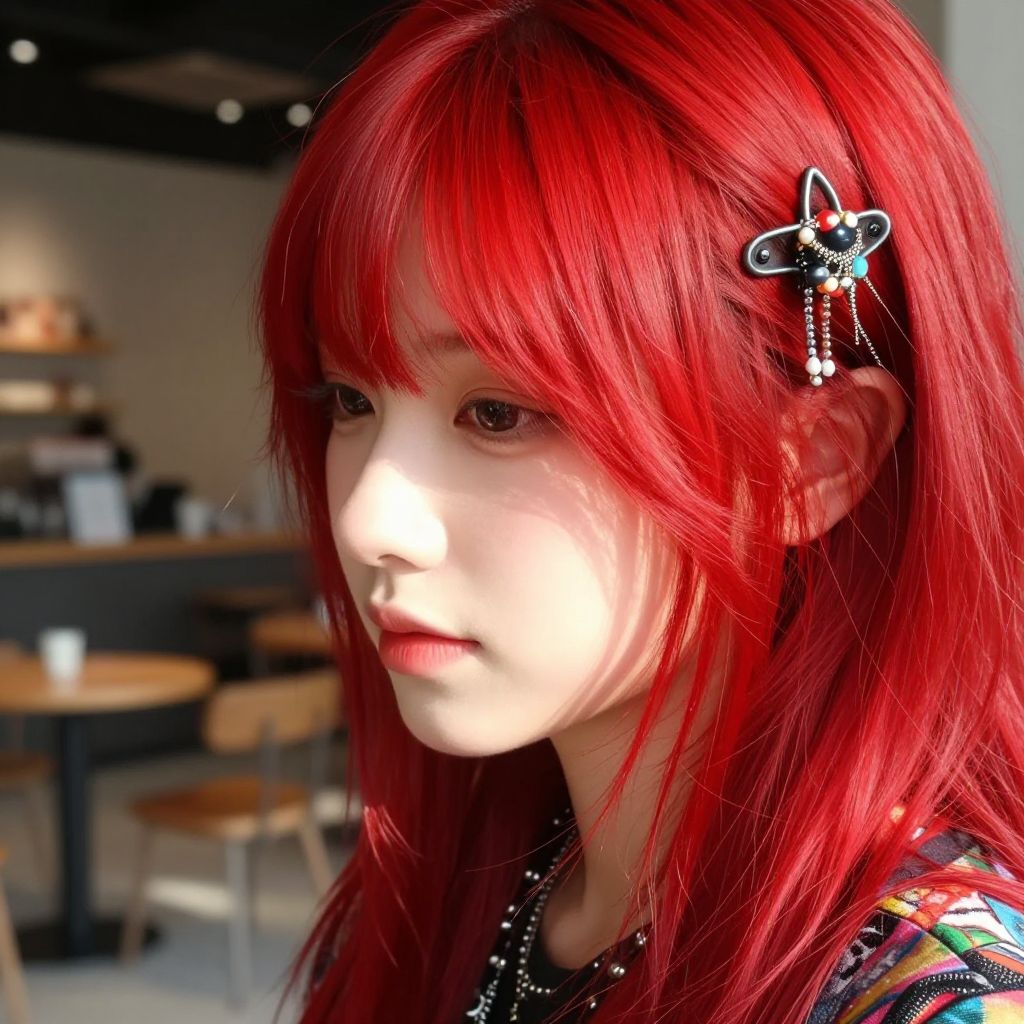 Close-up of a character with bright red scene hair, intricate hair accessories, soft blurred background of a modern café, light rays highlighting strands of hair, delicate skin texture, subtle punk-inspired outfit with colorful patterns, dreamy ambiance