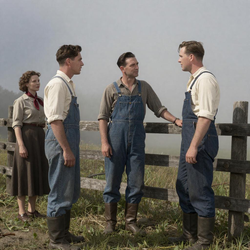 1930s movie still. Three men in overalls stand in a grassy field near a wooden fence. One man on the right talks to the man in the center, who faces him. Smoky background. Woman with a scarf on the left watches. Midday light.