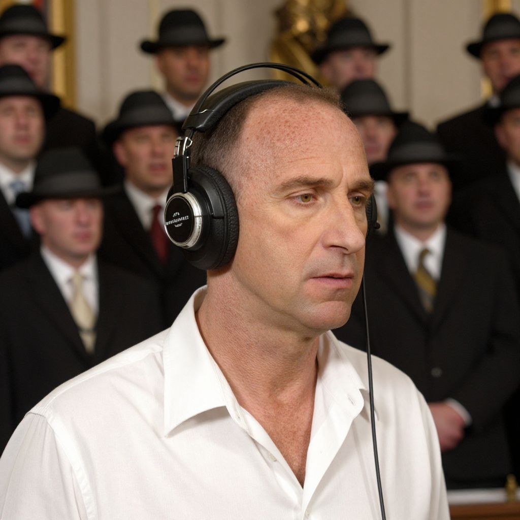 Portrait of a middle-aged man with short hair and a white shirt wearing large vintage headphones. He is surrounded by a choir of men dressed in dark suits, white shirts, ties, and black hats, standing in a formal setting.