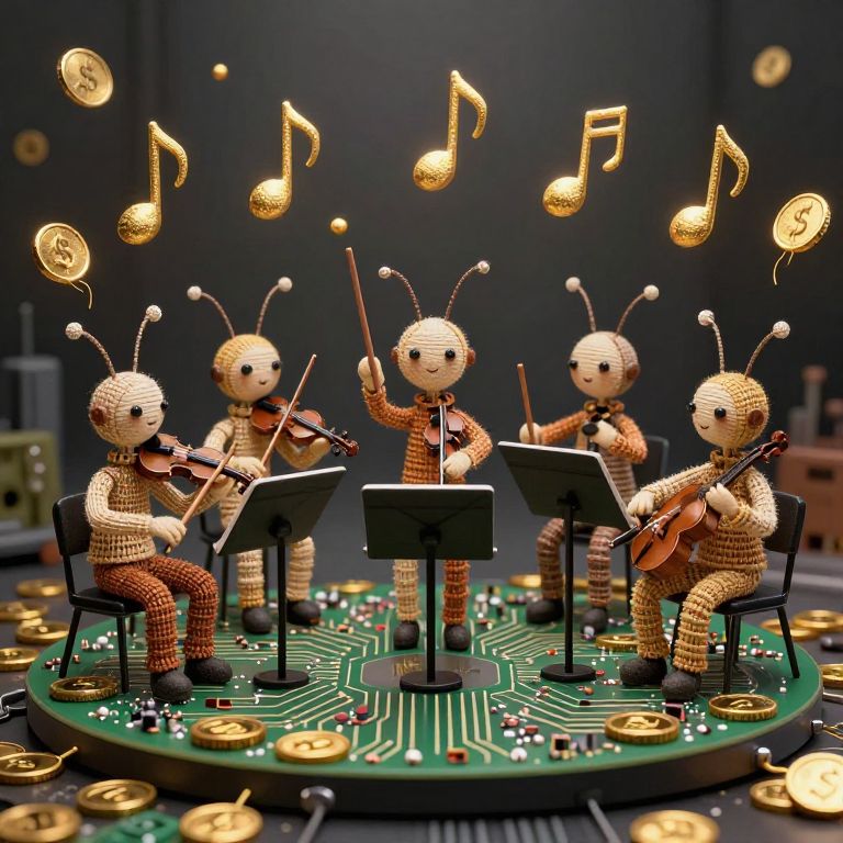 A whimsical orchestra of intricately woven humanoid figures, each adorned with antennae and wielding wooden sticks, performs a surreal symphony atop a circuit-board stage, where golden coins pulse like notes in an otherworldly rhythm.