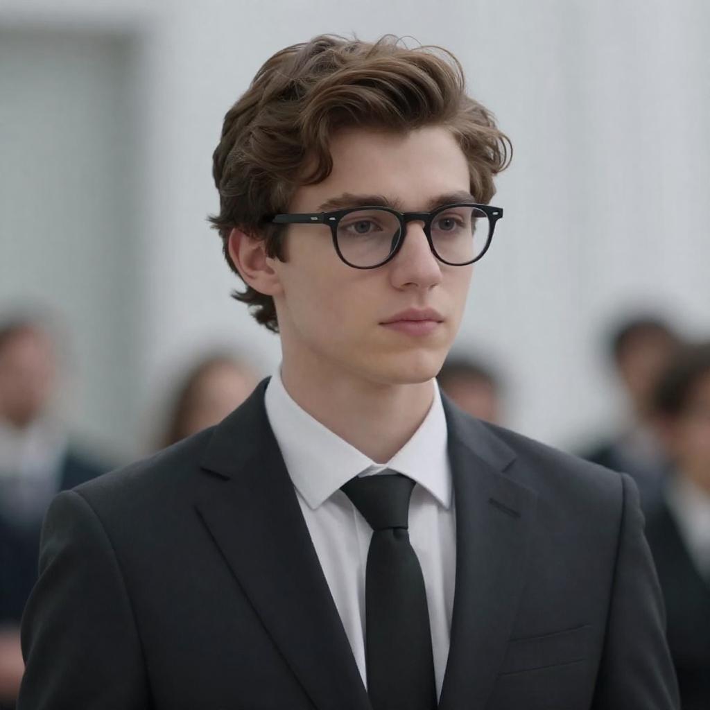 Photograph of a young man with fair skin, brown wavy hair, and black-framed glasses. He wears a dark suit, white dress shirt, and black tie. He looks slightly to the side with a neutral expression. Blurred background with white curtains and indistinct objects. Upper body portrait.