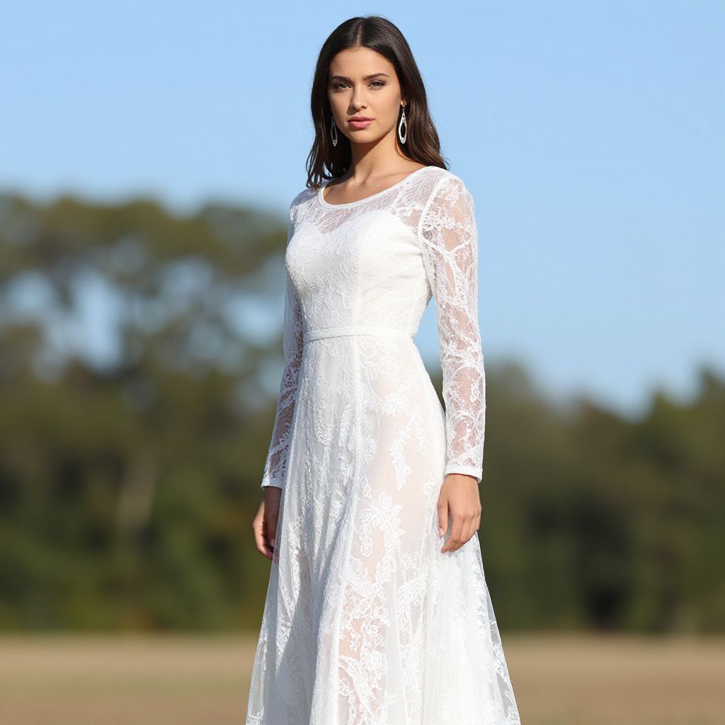 Lace gown costume, 1girl, solo, dress, white dress, looking at viewer, blurry, blurry background, outdoors, standing, brown hair, day, blue sky, long dress, see-through, tree, jewelry, earrings