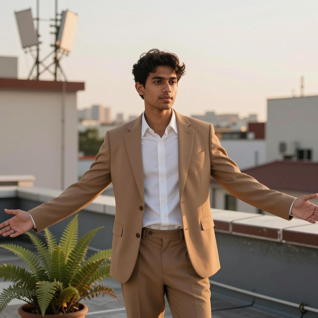 Young man with short dark hair, wearing a red and white striped knit robe, sits in a wicker chair. He holds a gray corded phone to his ear with his right hand and a glass of orange juice in his left hand. Background has dark green foliage. He has a slightly open mouth with a neutral expression. Papers are on his lap.