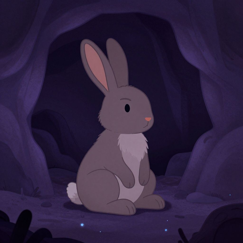 "Alpha Channel an half-man, half rabbit, sits unadorned in a dark purple cavern. there are some light blue motes on the ground,"