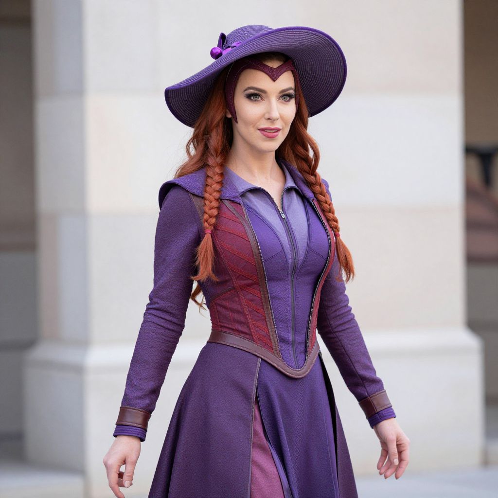 Scarlet Witch Purple Costume, woman in purple dress and hat with braids